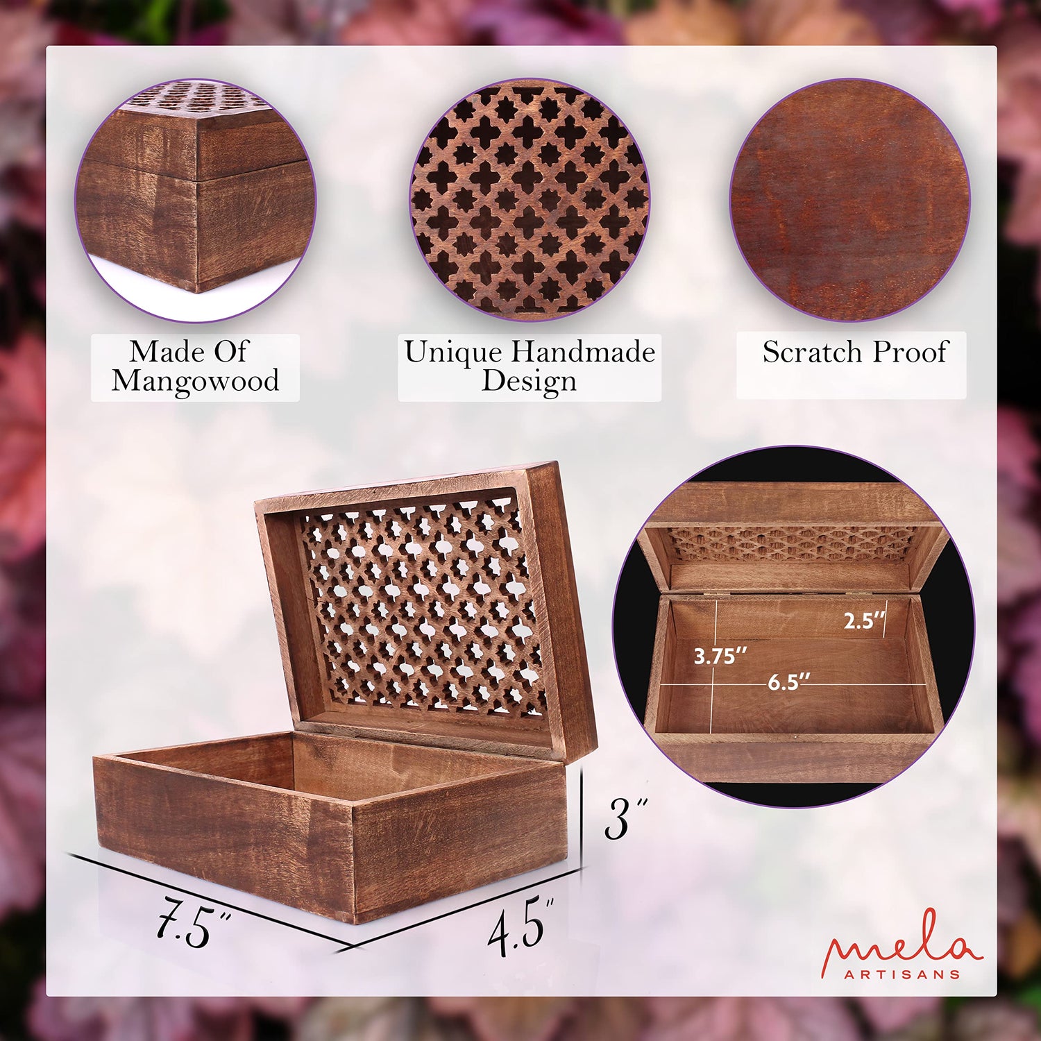 Details: Mela Artisans Trellis in Medium Polish Decorative Box This Wooden Storage Box is handcrafted from natural mango wood. It features quality craftsmanship from the creative hands of our Indian Artisans. Since we are utilizing Natural Mango Wood, we are able to promote the sustainability of the environment; in addition to the social uplift in the artisan community in which it was made. Using Our Decorative Boxes Our Wooden Storage Boxes vary in 3 different sizes. We have 7.5”, 9”, and 10.5” boxes that are perfectly sized for your needs. It highlights a hinged lid that allows opening and closing the box with ease. Quickly open to stash away or pull out all kinds of treasures! You can use our decorative boxes as a: Storage BoxJewelry BoxStash BoxKeepsake BoxTrinket BoxAnd More! Why We Choose Mango Wood Instead of Other Materials Aside from what is being mentioned earlier that Mango Wood is highly sustainable, we choose this material because it is a hardwood. Plus, it is: Readily availableNaturally decorativeSturdy and low-maintenanceDurable and water-resistantAs strong as cherry or ash wood Key Specifications: Material: Mango Wood Size: 7.5 x 4.5 x 3 inches Finish: Medium Polish If you are looking for a Premium Quality Wood Storage Box, try Mela Artisans Decorative Boxes! Click the “Add To Cart” button to order your very own Stash Box today!