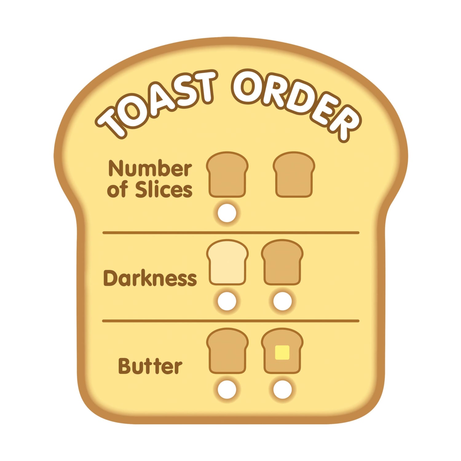 - Includes wooden toaster, 2 slices of bread, 4-pat stick of butter, butter dish, knife, reusable activity card