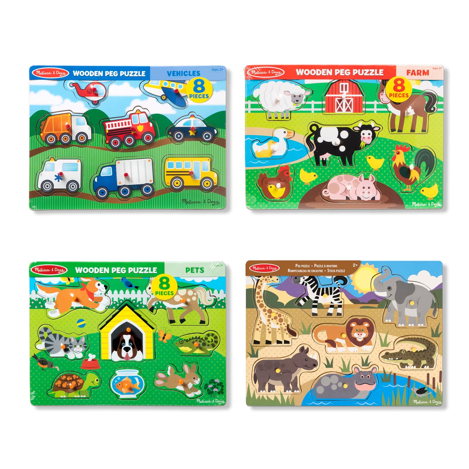 Melissa & Doug Wooden Peg Puzzle 4-Pack for Toddler and Preschool Boys and Girls – Vehicles, Farm, Safari, Pets
