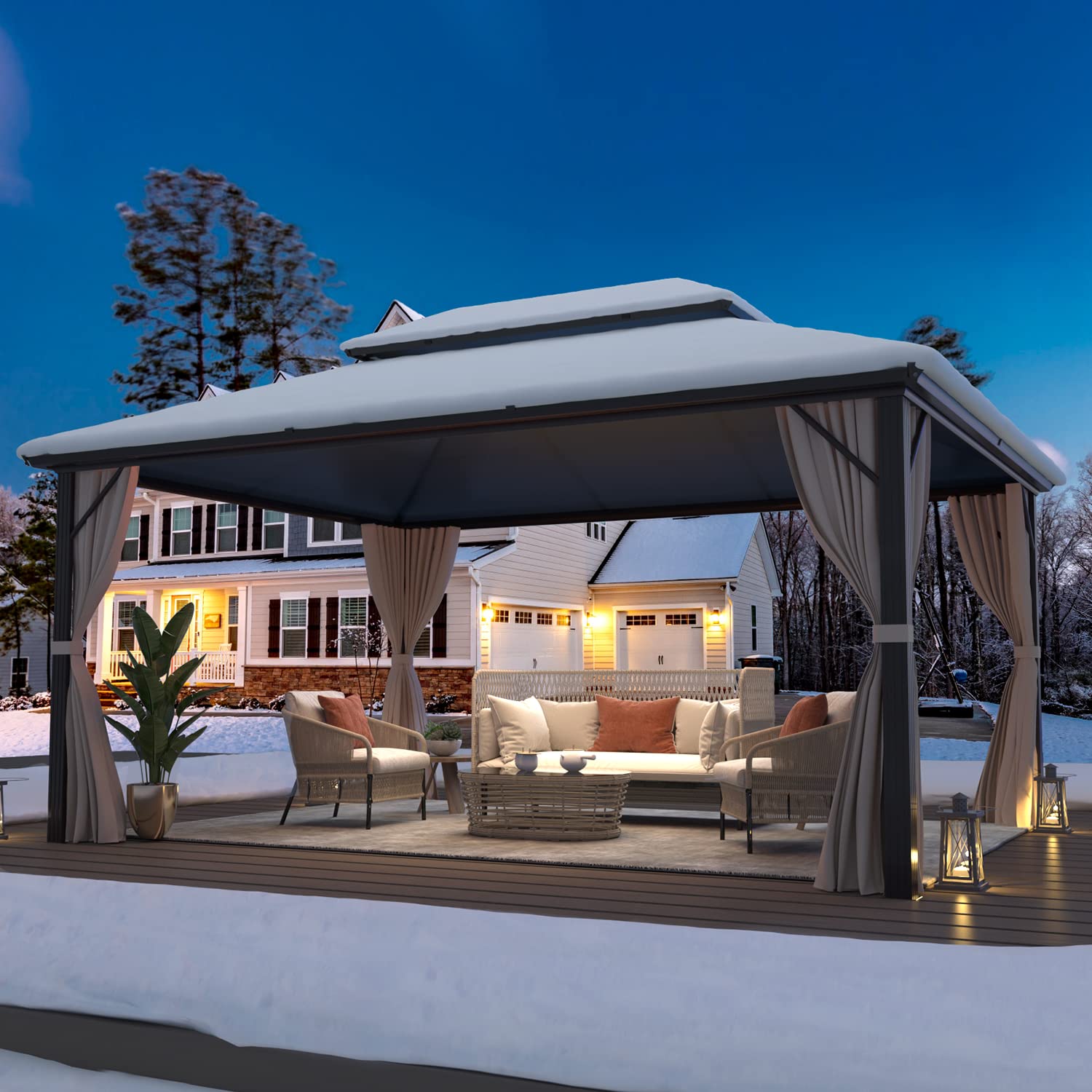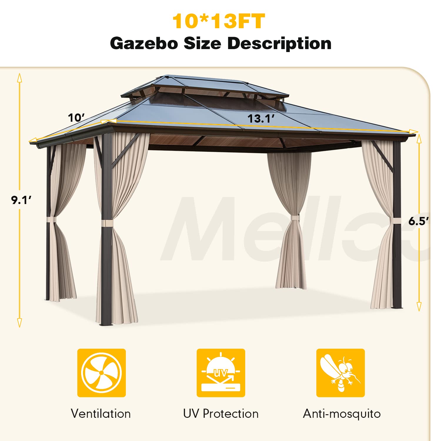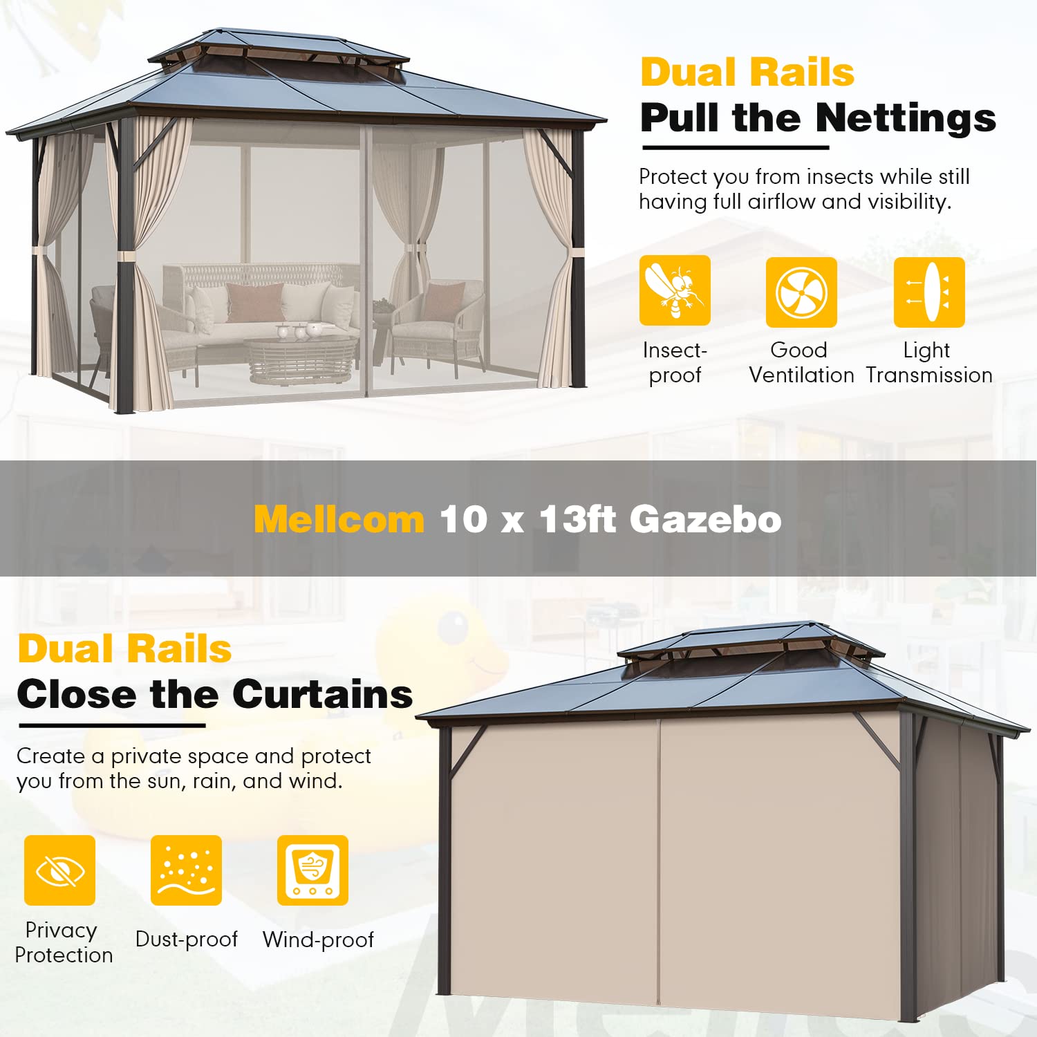 MELLCOM 10 x 13ft Hardtop Gazebo, Polycarbonate Double Roof Aluminum Gazebo, Outdoor Waterproof Canopy Gazebo with Netting and Curtains for Backyard, Deck, Patio