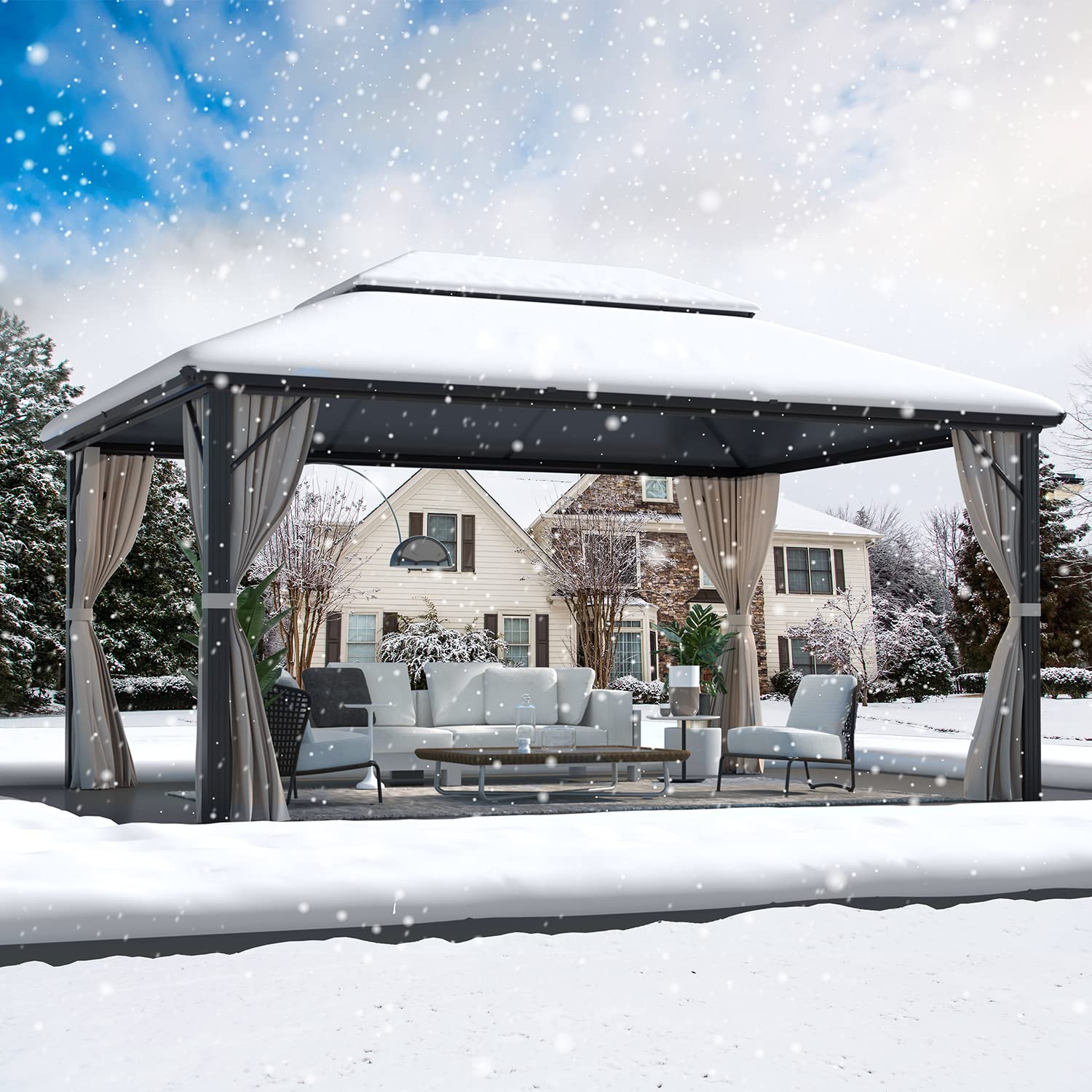 - 【Hardtop Polycarbonate Double Roof】Our polycarbonate double roof features three-layer protection that reduces the heat while blocking 99% of harmful UV rays and preventing water from leaking. The design of a double top with netting allows wind to pass through so that can provide ventilation and insect-proof. The gazebo is sturdy enough to withhold heavy snow and wind. The sleek overhang roof design also prevents rainwater from gathering.
