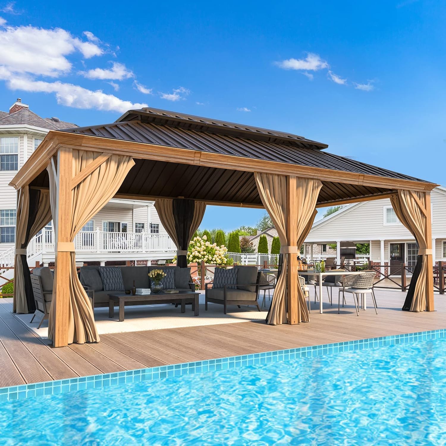 - 【Wood Grain Aluminum Frame】Euqipped with wood-looking powder coated, the real aluminum posts look like natural wood but are sturdy and durable enough for your outdoor use. The wooden-looking finish gazebo gives a natural feel that won't decay or crack like real wood or rust like the iron frame but last for many years.
