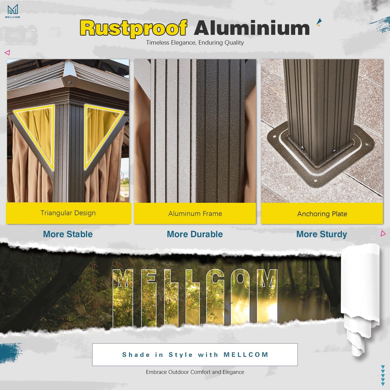 - 【RUSTPROOF ALUMINUM FRAME】Sturdy permanent gazebo built with 4.0"x4.0" triangular powder-coated aluminum frame, which is more stable and durable than standard others. The gazebo with pre-drilled bases is designed for all kinds of uneven ground and can be installed in different outdoor situations.