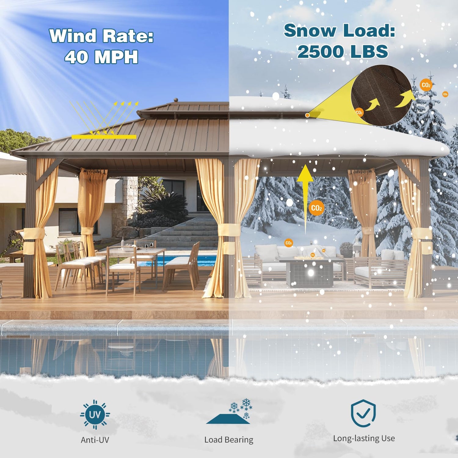 - 【GALVANIZED STEEL DOUBLE ROOF】Instead of fabric & polycarbonate, our fade-resistant & rust-resistant galvanized steel roof keeps out bright light and harmful UV rays, making the metal gazebo strong enough to withhold heavy snow and wind. The double top design facilitates ventilation, cooling and slowing down the wind speed.