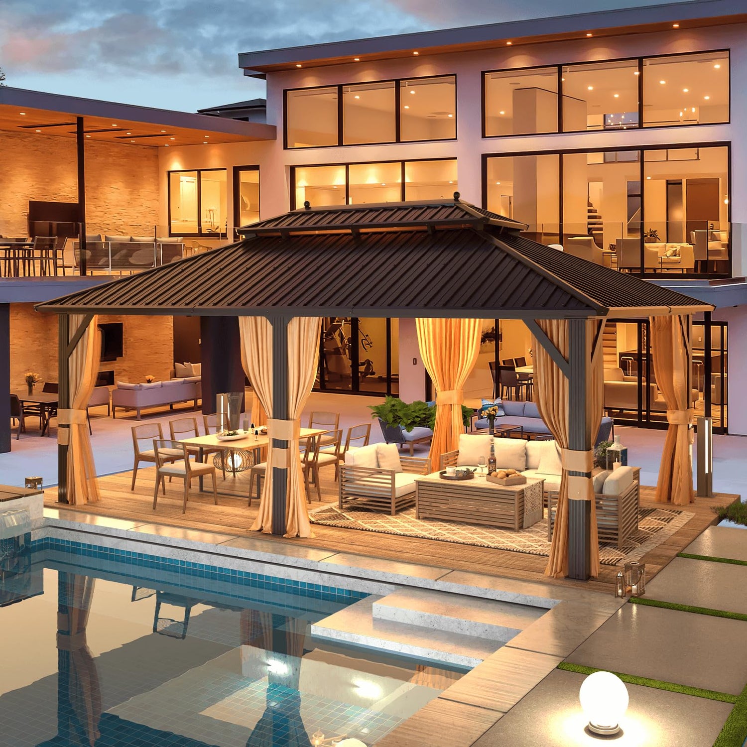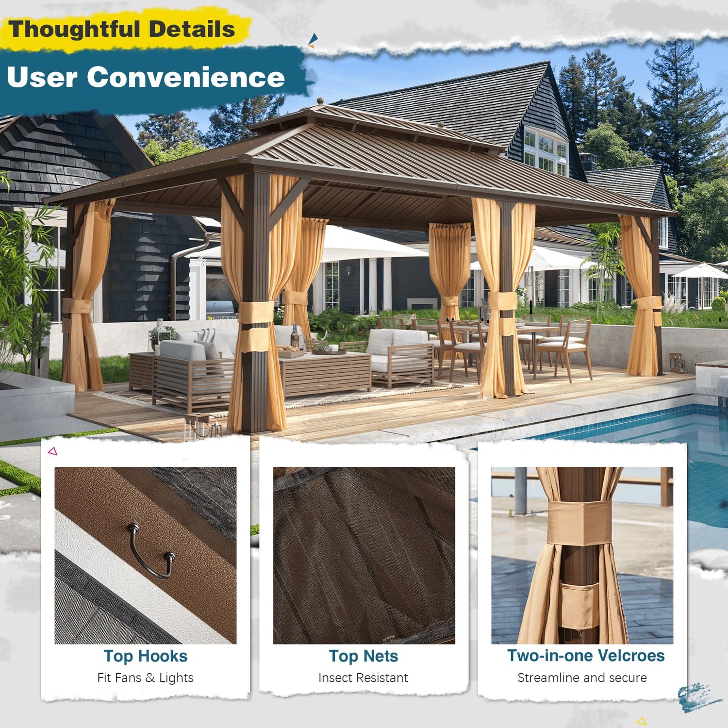 - 【NETTING & CURTAINS & HOOKS】Fully enclosed zippered removable double-layer PBV-coated curtains and netting protect you from UV rays while adding more privacy. Equipped with hooks on the top roof, it can be used to hang up the lights and fans to enrich the aluminum hardtop gazebo.