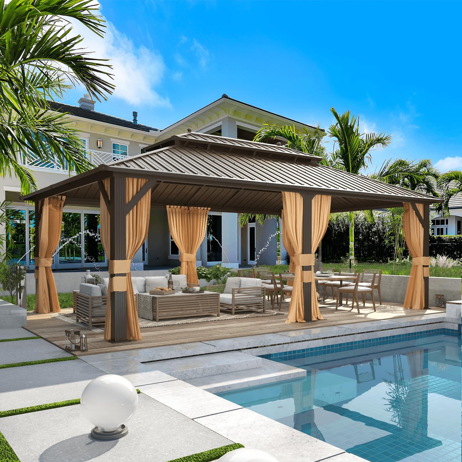 MELLCOM 12'x20' Hardtop Gazebo, Galvanized Steel Metal Double Roof Aluminum Gazebo with Curtain and Netting, Brown Permanent Pavilion Gazebo with Aluminum Frame for Patio, Lawn & Garden