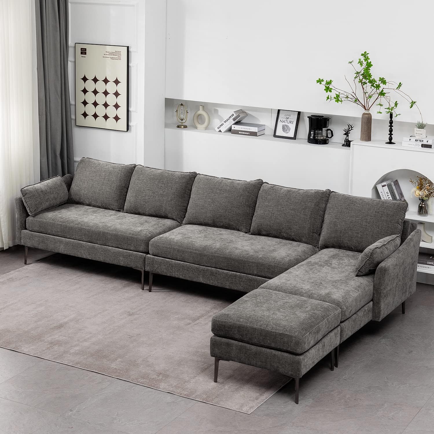 MELLCOM 137.4" Cloud Couch Sectional 5-Seat L Shaped Modular Sofa w/Chaise & Ottoman, Comfy Memory Foam Modular Couch in Washable Chenille Fabric, Sectional Sofa for Living Room, Grey