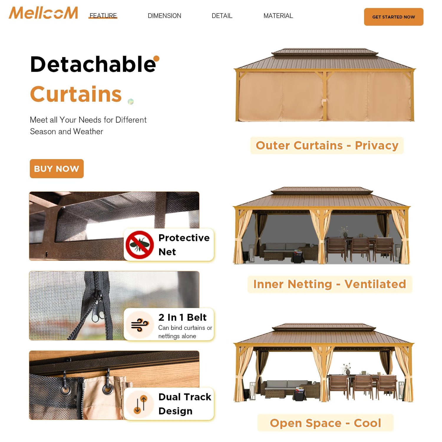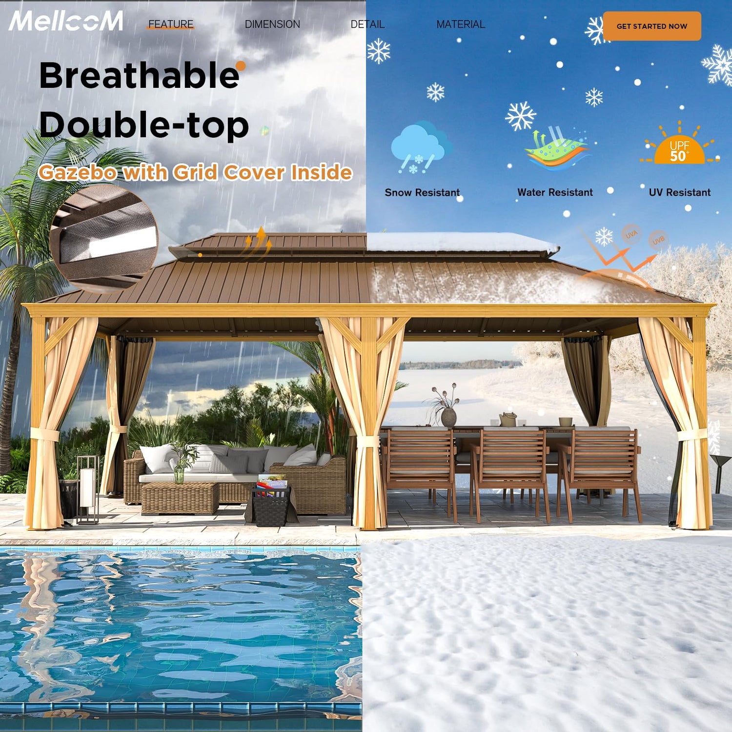 MELLCOM 14' x 22' Gazebo, Hardtop Gazebo Wood-Looking Gazebo with Galvanized Steel Double Roof, Aluminum Frame, Outdoor Patio Hardtop Gazebo with Netting and Curtains for Deck, Backyard, Patio, Lawns