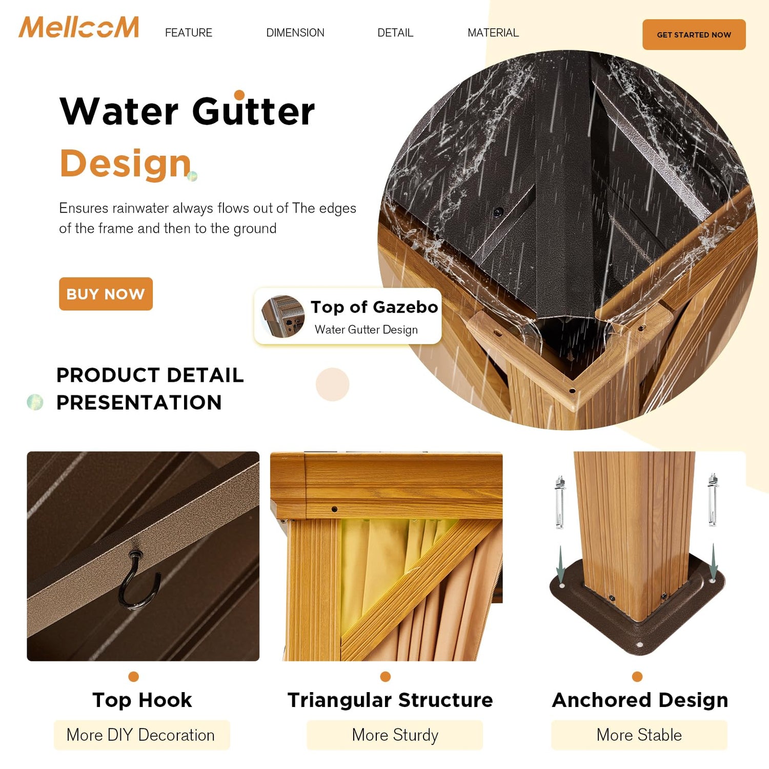 - 【Wood Grain Frame】- This outdoor gazebo features a sturdy and durable 4.8"x4.8" triangular aluminum frame with a natural wood-like appearance achieved through thermal transfer printing. This provides excellent protection against scratches, peeling, corrosion, and rust, ensuring a long service life.