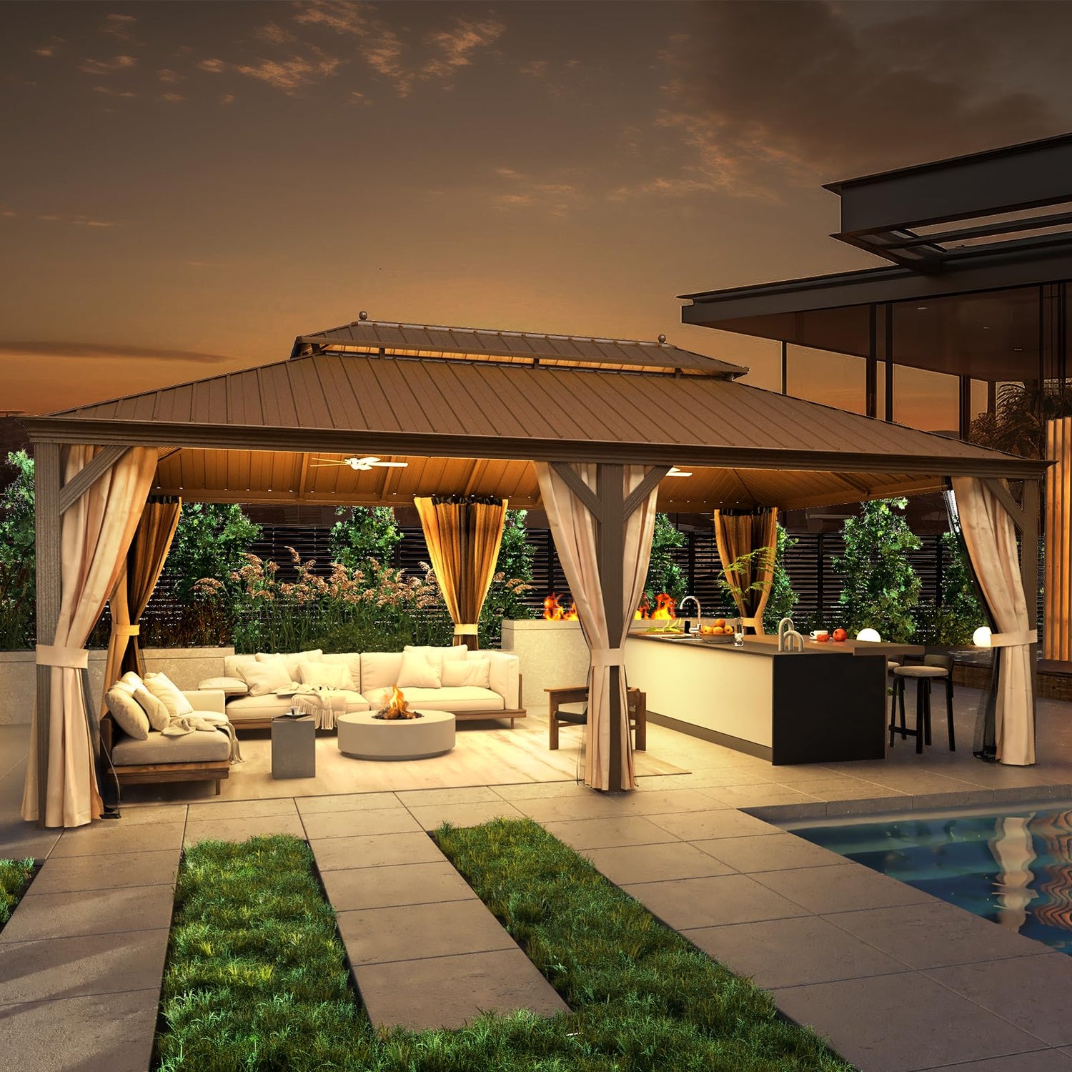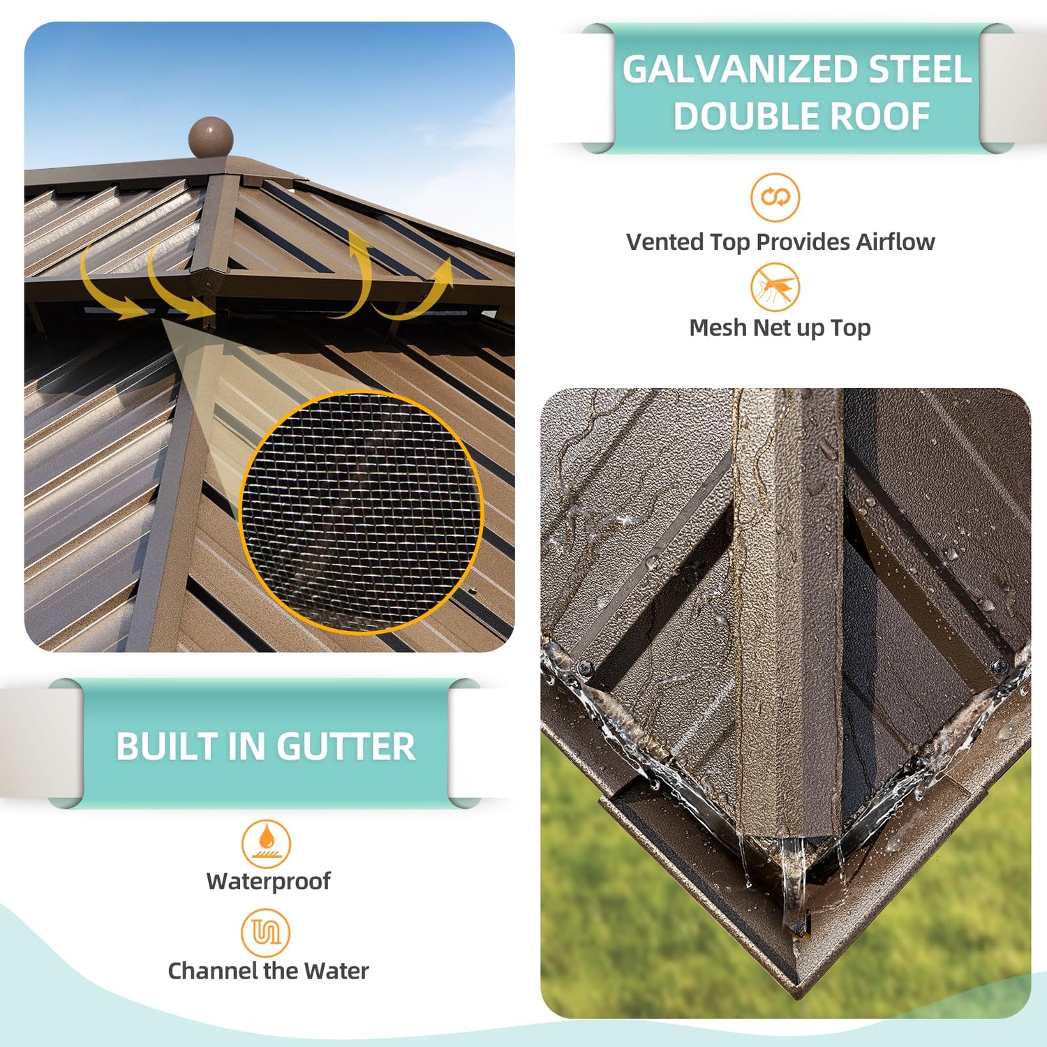 - GALVANIZED STEEL DOUBLE ROOF: Replacing fabric/polycarbonate, our gazebo features a fade-resistant and rust-resistant galvanized steel roof that effectively blocks bright light and harmful UV rays. The water gutter design ensures rainwater drainage from the edges of the roof and poles, preventing water pooling. With its vented double roof design, our hardtop gazebo improves ventilation and lessens the impact of strong winds.
