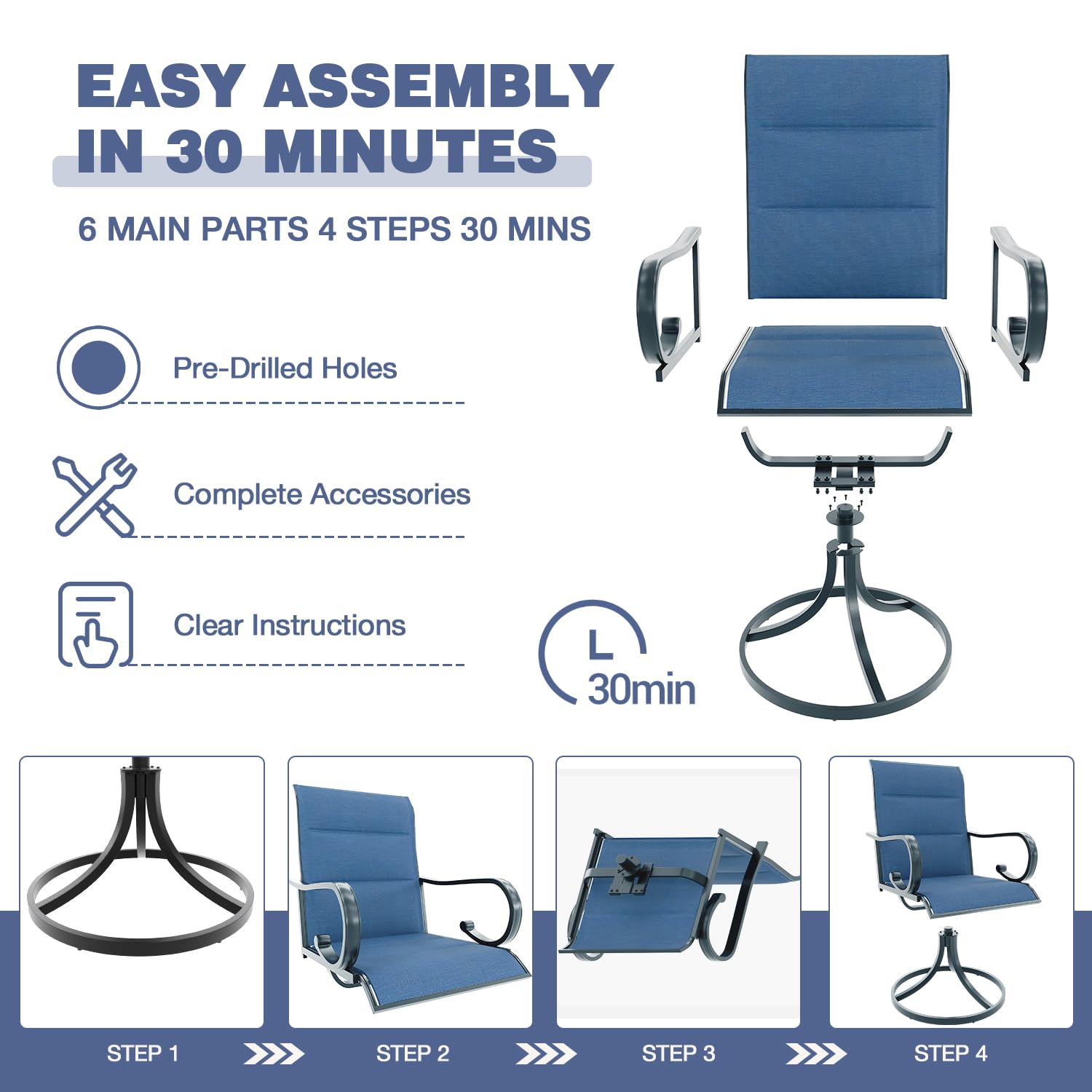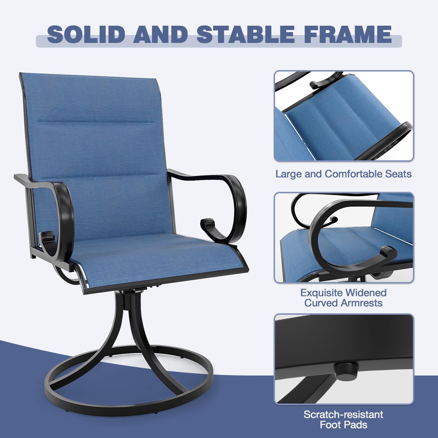 - 360° Swivel & 15° Rocking Chairs: The swivel rocking chairs offer a gentle rocking motion and 360-degree smooth rotation. Perfect for relaxation, these patio rockers are designed to support comfort and ease, allowing you to unwind after meals or enjoy a sunny afternoon
