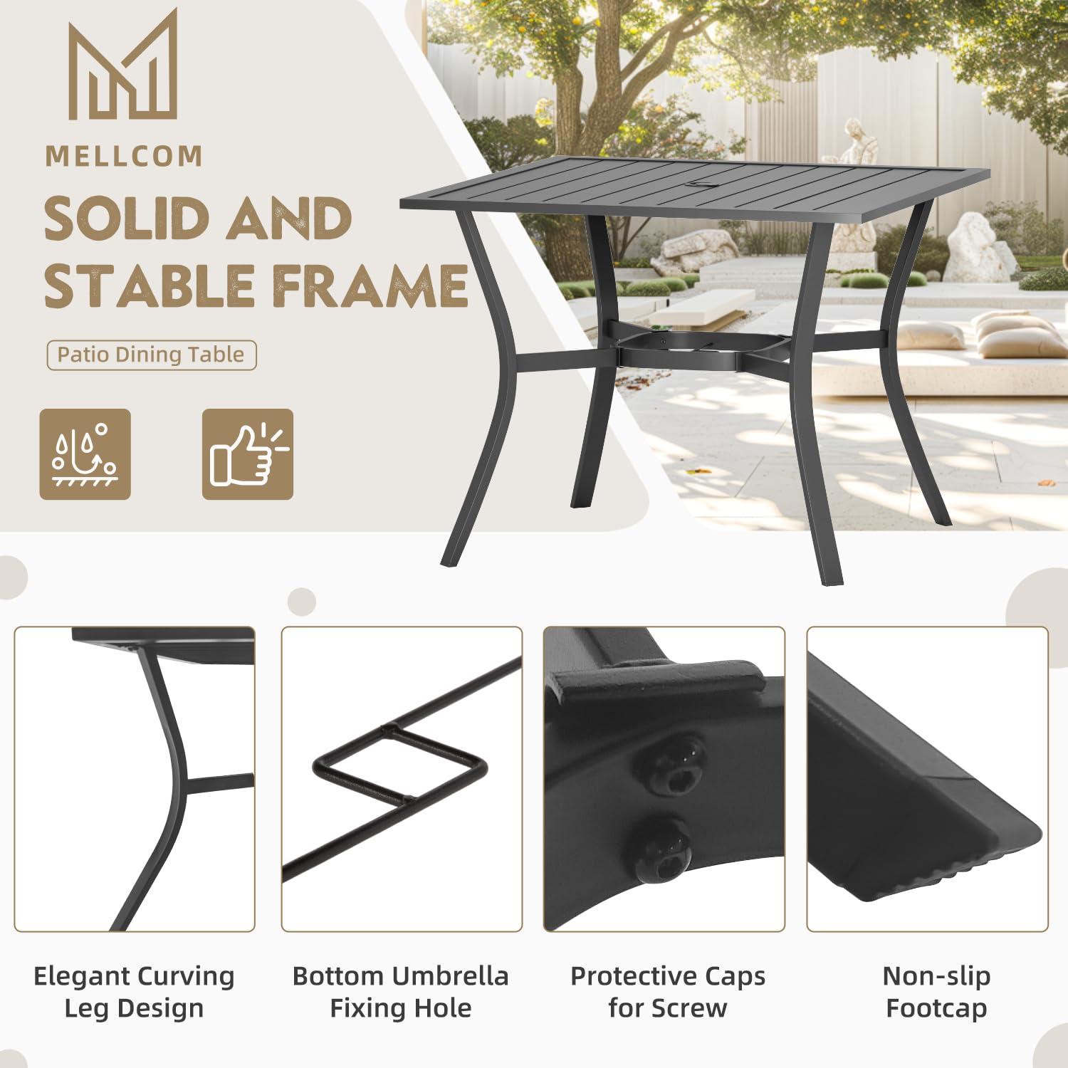 - Patio Table with Umbrella Hole: Equipped with a 1.57" umbrella hole (fits most market umbrellas), this patio table with umbrella hole ensures shade in sunny days. Powder-coated steel frame and weather-resistant metal desktop withstand rain and rust, perfect for year-round outdoor use
