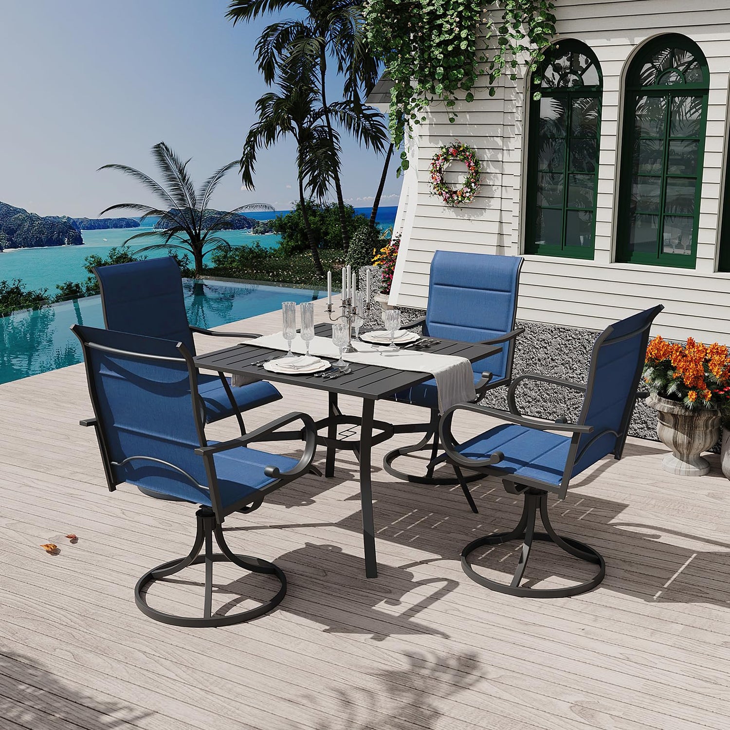 MELLCOM 5 Pieces Outdoor Dining Set, 4 Swivel Rocker Chairs with High Back Textilene & Square Metal Dining Table with Umbrella Hole, Patio Furniture Set for Porch, Garden, Backyard, Deck, Blue