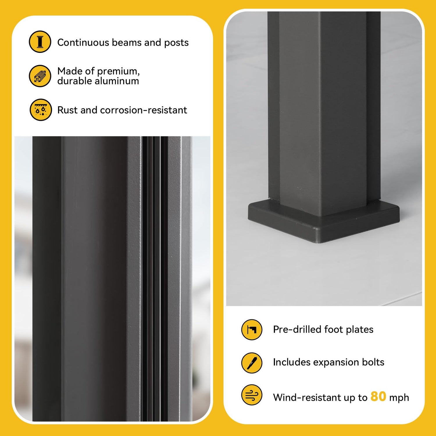 - HEAVY-DUTY ALL-ALUMINUM: The aluminum frame, powder-coated in matte dark grey, ensures durability with rust-free, weatherproof, and UV-protected properties, guaranteeing long-lasting without color fading. The attached louvered pergola comes equipped with pre-drilled parts and expansion bolts, ensuring a straightforward installation on any flat, solid surface. The triangular polycarbonate panels on both sides allow light to penetrate, bringing natural brightness underneath