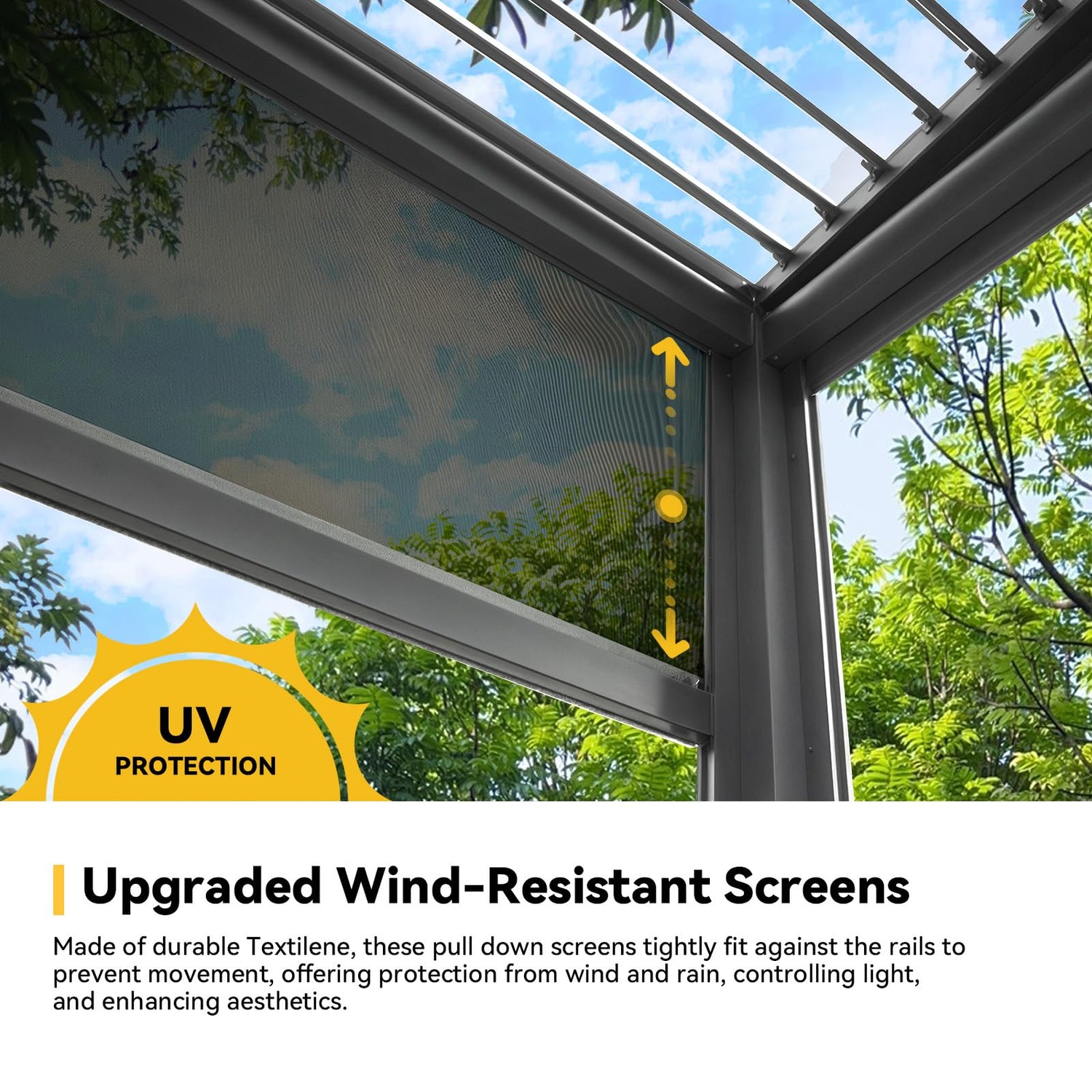 - 4 PULL DOWN SCREEN SIDES: Unlike traditional curtains, our upgraded side screens are seamlessly integrated with the luxury louvered pergola, providing weather resistance against wind, rain, and blinding sunlight, while allowing natural light to filter through and offering privacy and UV protection. Easily adjust 4 screens to your desired height with the bottom rod for quick control, and when not in use, simply lift them into their casing for retraction