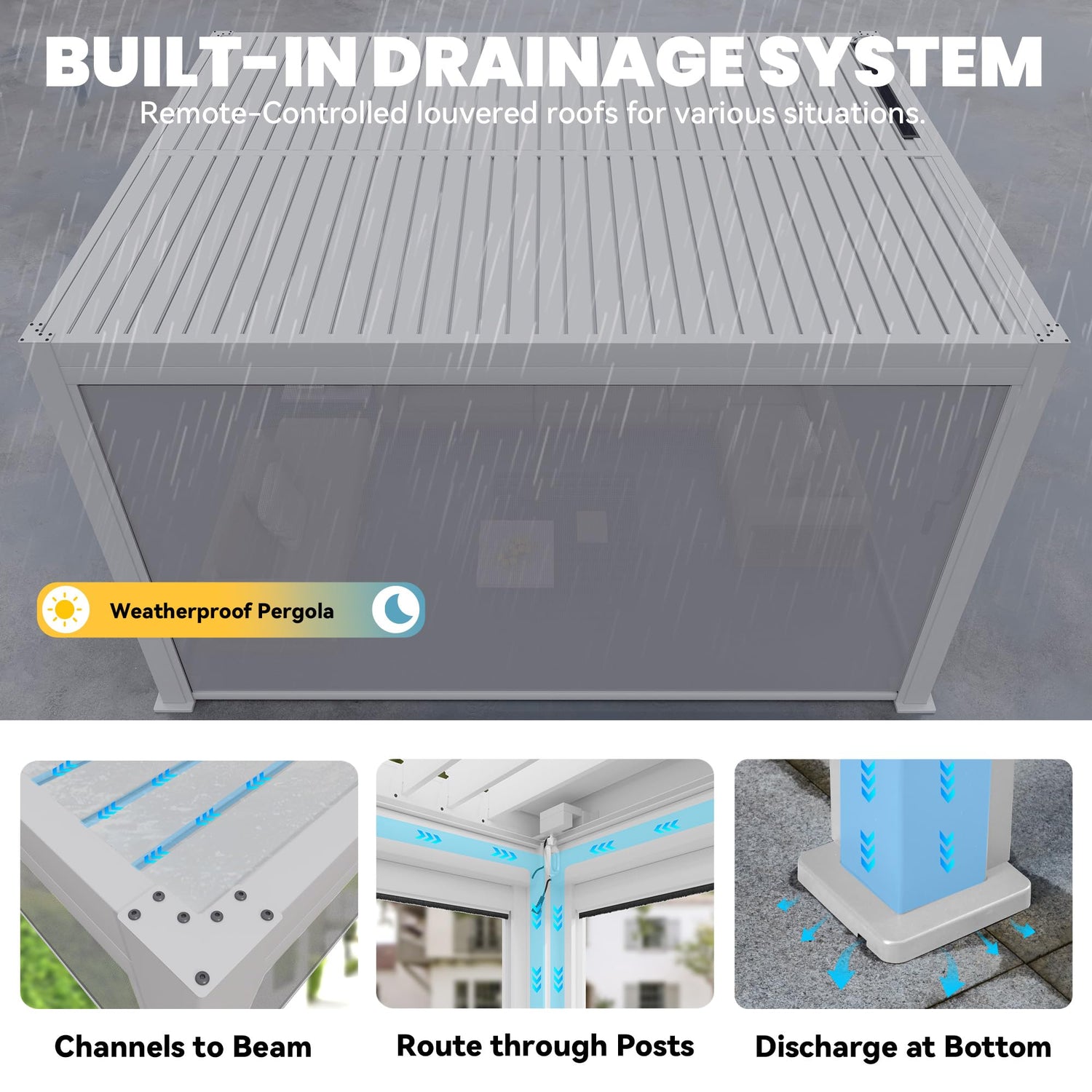 - DRAINAGE SYSTEM: The electric adjustable louvered roof allows precise control over sunlight and shade, providing 100% waterproof shelter. Rainwater flows into the gutter beams and drains through the legs, ensuring a dry, weatherproof space beneath the powered louvered pergola, so outdoor activities remain uninterrupted regardless of the weather.