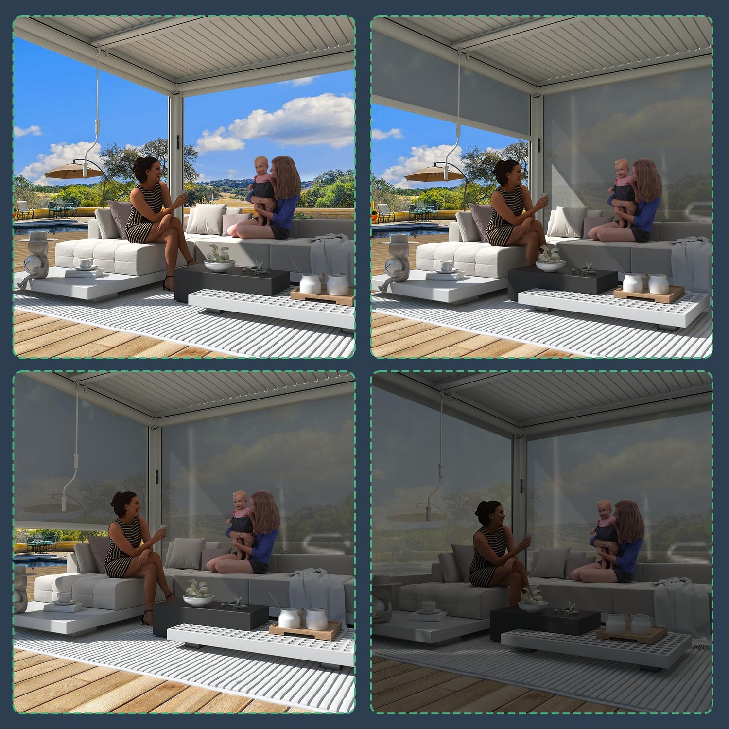 - SMART ELECTRIC CONTROL: With the integrated post and remote controller for this electric pergola, you can control the opening and closing of the motorized roof, the 4 pull-down screens, and the LED lighting—all with the touch of a button, providing maximum comfort and convenience. The screens offer excellent weather resistance against wind, rain, and sunlight, while also enhancing privacy, with the option for independent or simultaneous control of each screen.