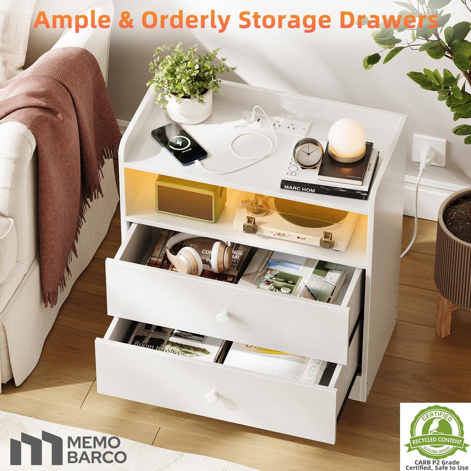 Memobarco Nightstand with Charging Station and LED Light,Modern Nightstand with USB Ports and Outlets,Wood Bedside Tables with 2 Storage Drawers,Small Dresser for Bedroom Small Space,White