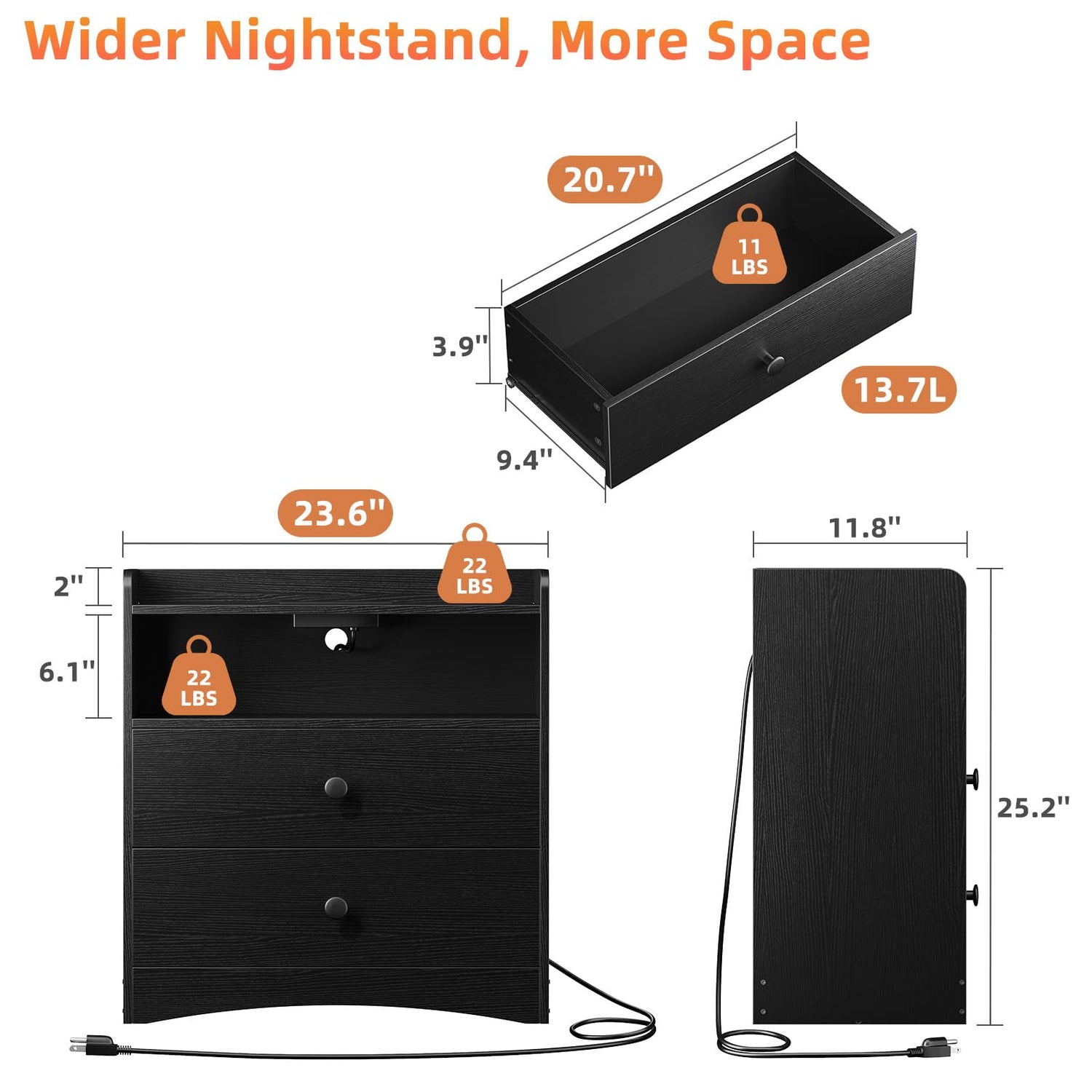 - 【Dimensions & Load Bearing】Large Wood Night stand Overall Sizes:23.6" W x 11.81" D x 25.19" H;The dresser for bedroom maximum load capacity is 66lbs,11lbs for each drawer and 22lbs for top and open shelf