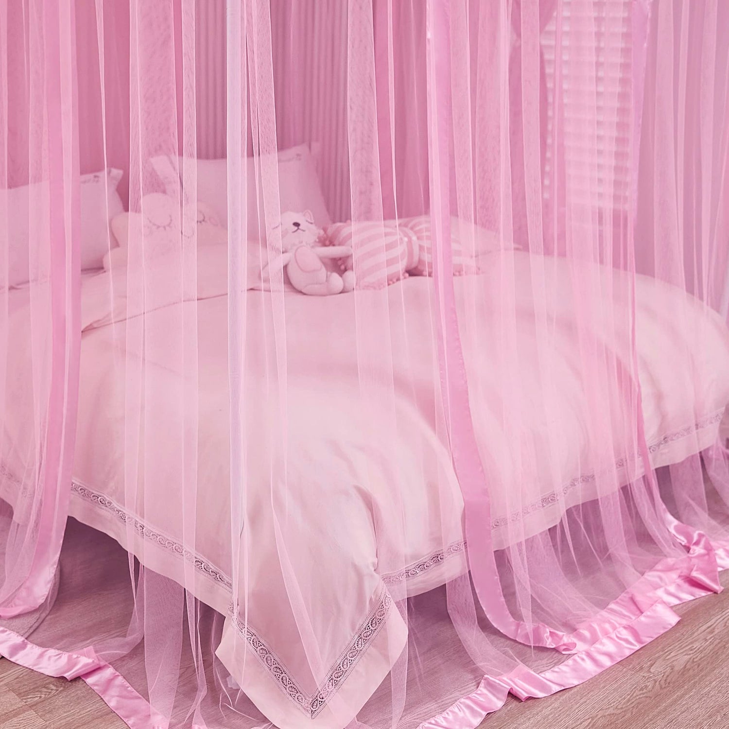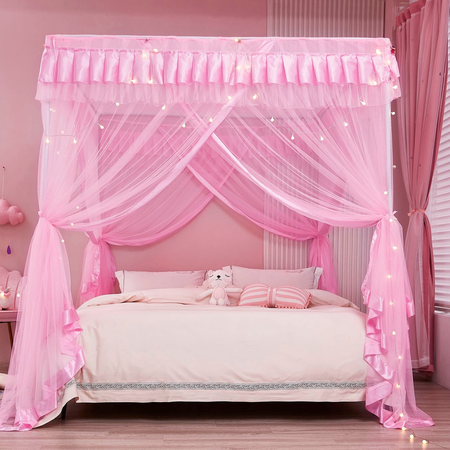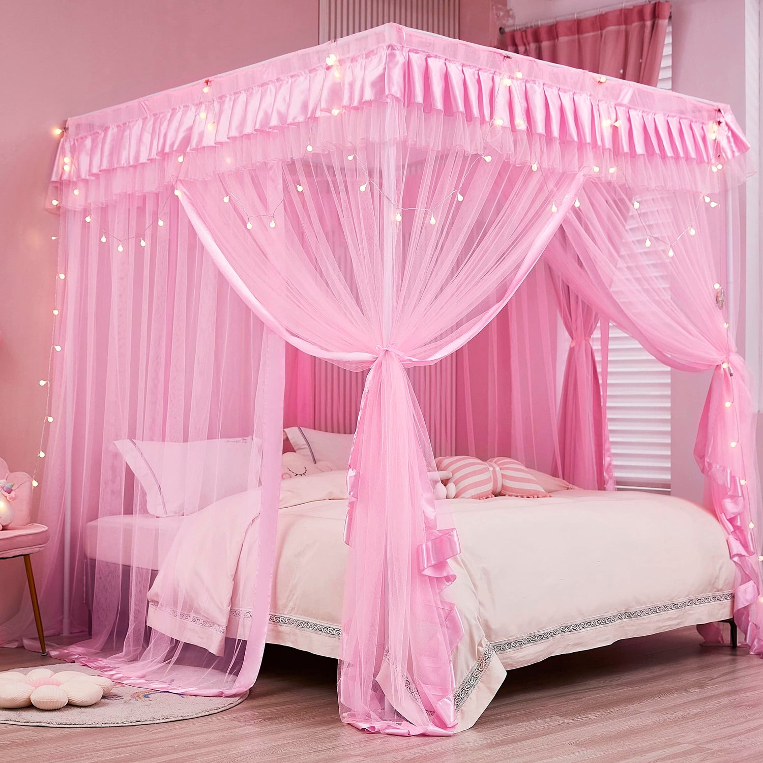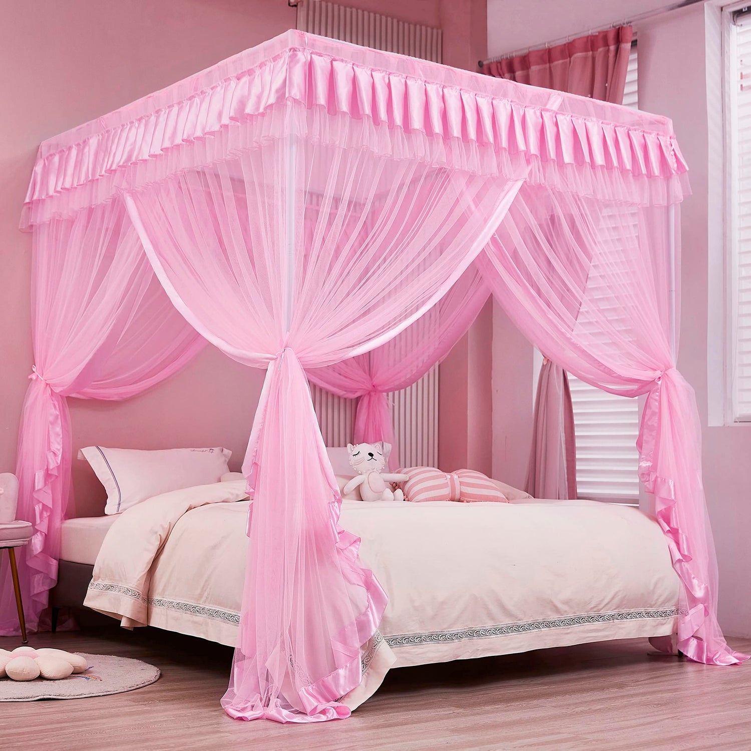 Mengersi 4 Corners Post Canopy Bed Curtains for Girls Full Size - Royal Luxurious Cozy Drape Canopy Bed Frames Netting for Kids Adults- Cute Princess Bedroom Decoration (Pink)