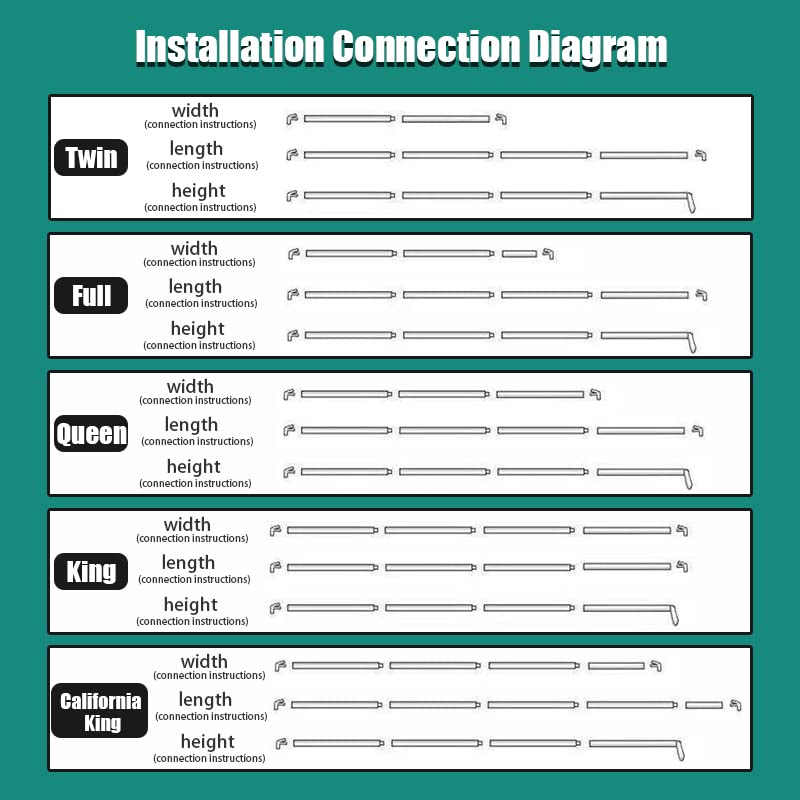 - King Size:78"WX 78"LX 78"H,16 rods of height, 8 rods of length and 8 rods of width. The frame is very easy to install, use a T-joint to connect the height pole, length pole and width pole, then place the stand feet under the foot of the bed.