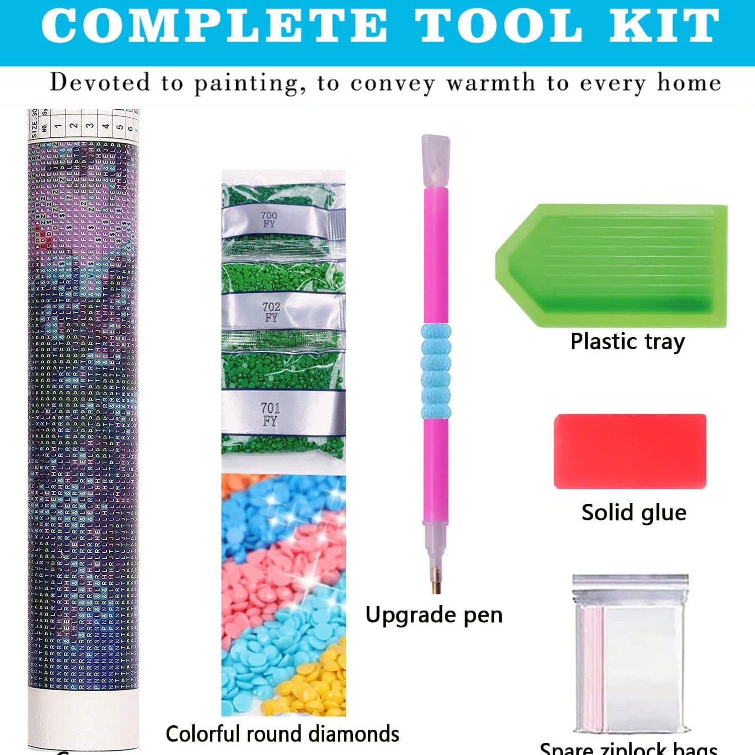 - Package Included: 1*canvas(13.8x13.8inch 35x35cm),1*diamond painting pen , 1* glue, 1*new design plastic tray, 10 * self-sealing bags and enough round diamonds. You get about 30% extra beads in every color. A Diamond Canvas Kit lets you make stunning diamond art, no artistic skills required.