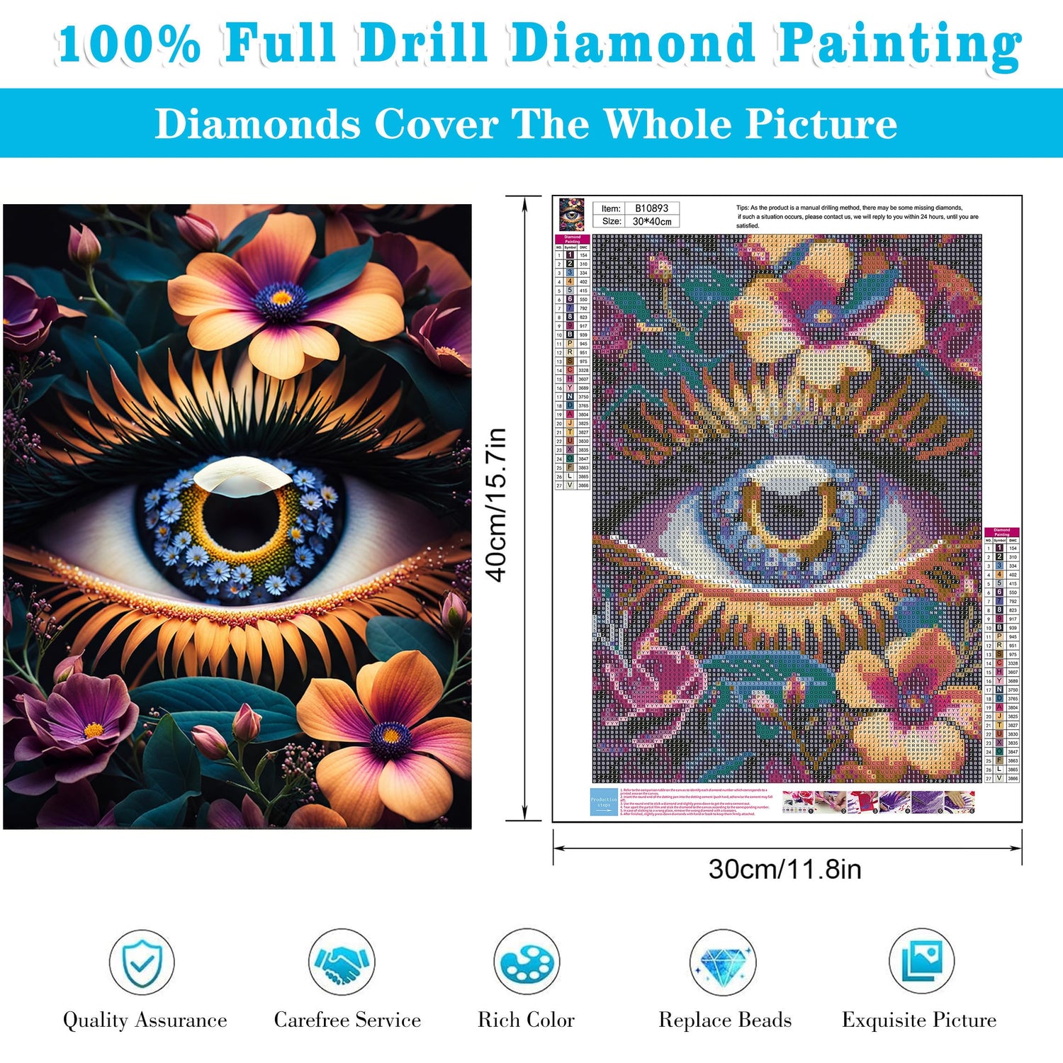 - đăEyes diamond painting kitsă1x high definition painting canvas;1x color coded rhinestones;1x point diamond pen;1x craft tray;1x clay;10x self-sealing bags.Note:The frame is not included.Donât worry about the lack of diamonds.There are 30% excess drill beads in each section,definitely no worry of running out or not having enough.