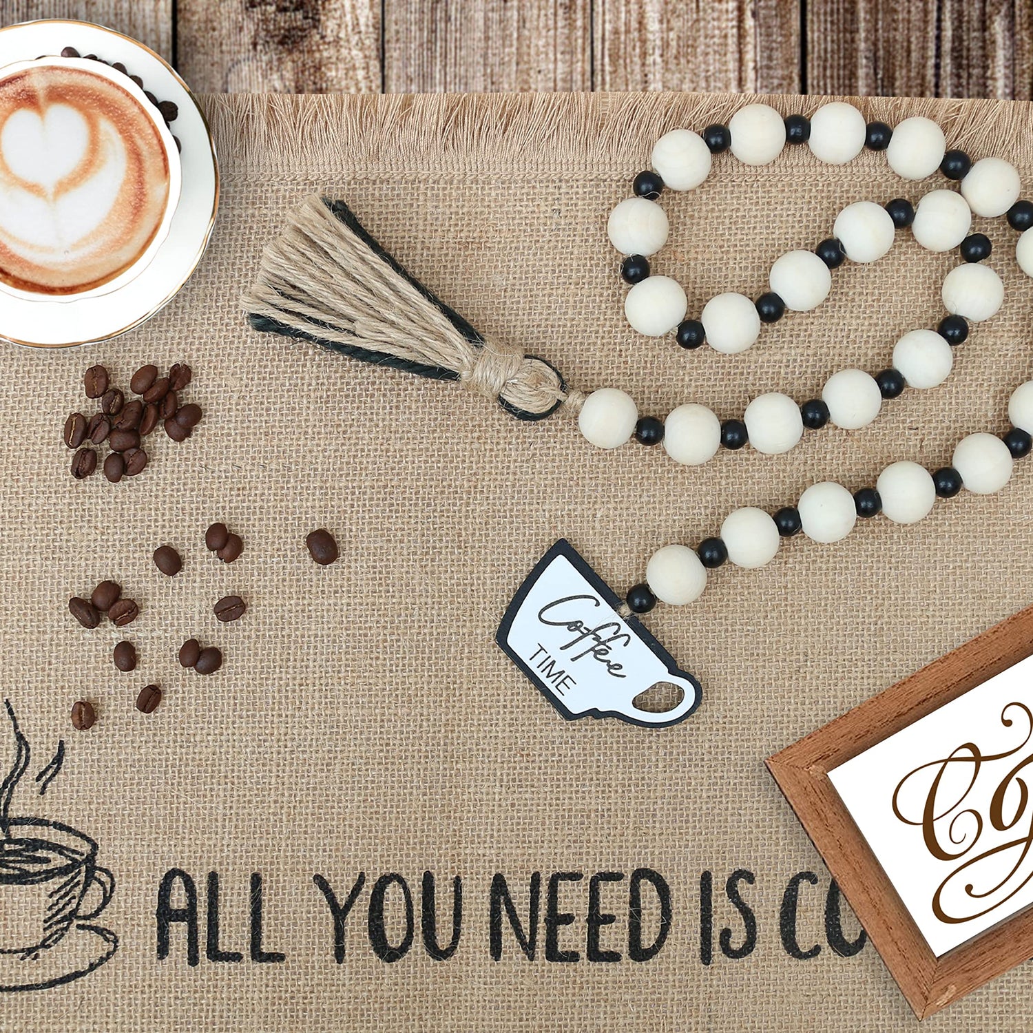 - MATERIAL: coffee bar decor is made of natural wood beads with jute rope.It is shown with a 3.54in jute tassel and a wooden coffee sign that says "COFFEE TIME" on the other end.