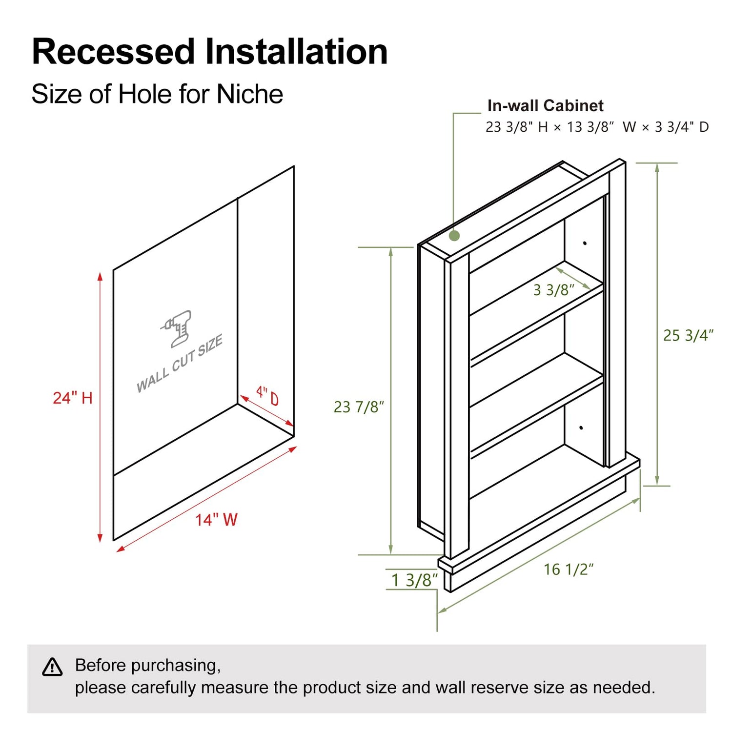 - 【14x24 In Wall Cabinet】The design is recessed wall niche, saving wall space and being more aesthetically pleasing, and it is important to measure the exact wall size before purchasing Recessed cabinet embedded in wall: 23.6 "Hx14.0" Wx3.7 "D, Wall niche front: 26.4 "Hx17.5" Wx4 "D.