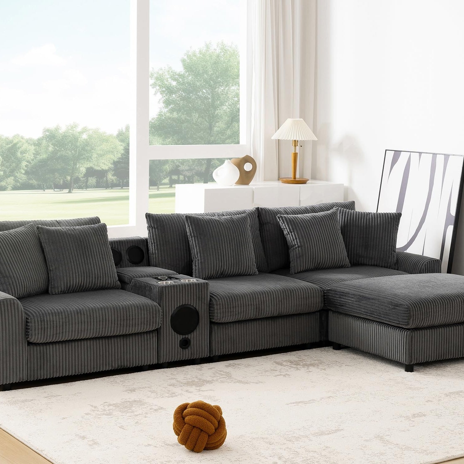Merax 114 * 64" Corduroy Sectional Couches with Bluetooth Speakers, Storage, Ottoman & Pillows, Upholstered Modular Sofa Chaise with Console, USB Charger, Cup Holders for Living Room Apartment, Grey
