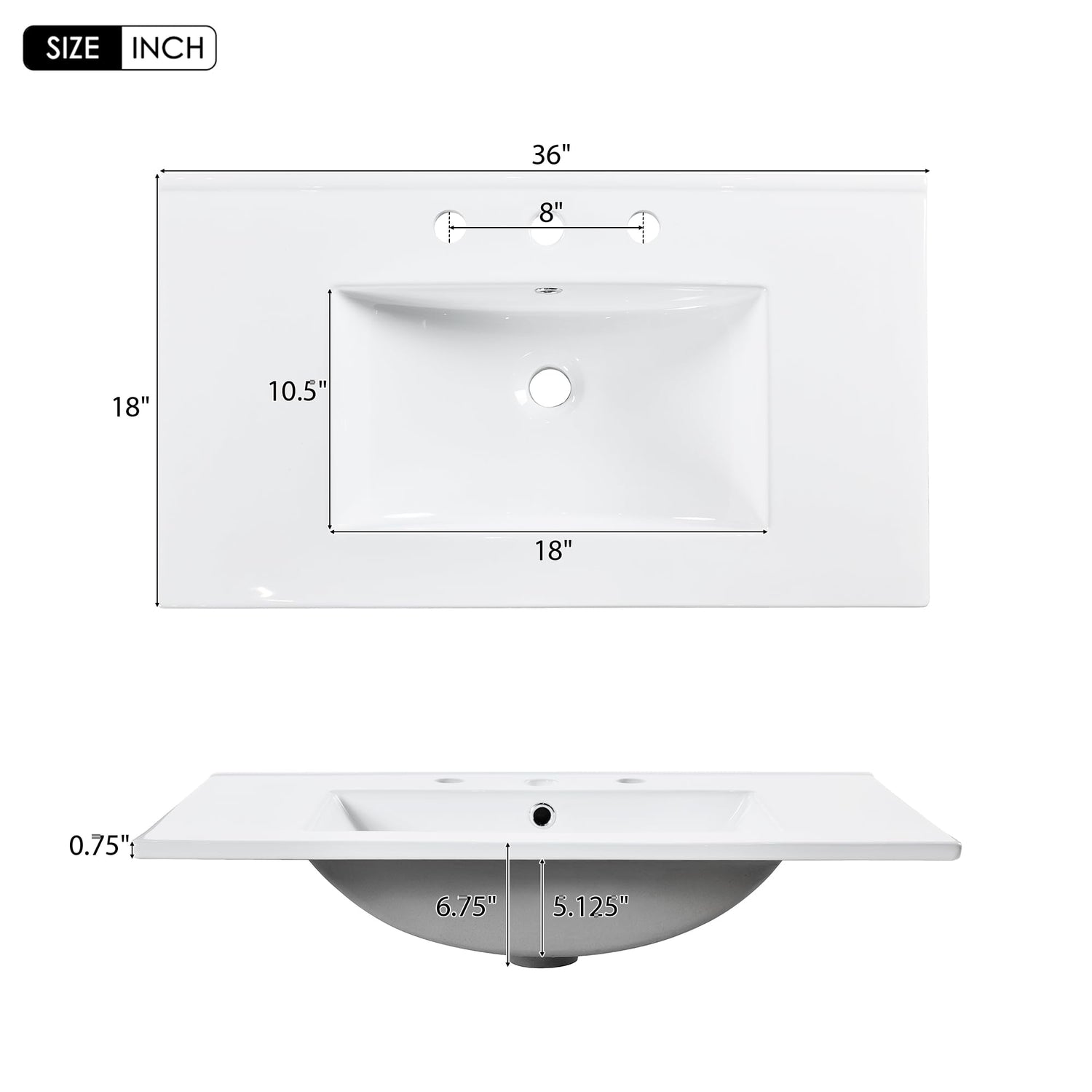 - The white countertop with integrated single sink makes this bathroom vanity cabinet highly presentable. The glossy ceramic surface ensure non-stain, scratch-resistant, maintenance-free use. Pre-drilled with 3 holes to accommodate 8" widespread faucet (faucet not included). Equipped with an overflow drain to help prevent water overflow and spillage.