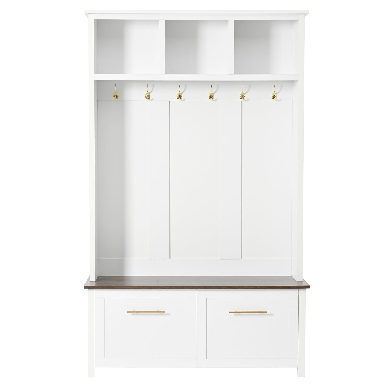 Merax 47" Farmhouse Wood Hall Tree with Bench, Entryway Coat Rack with 6 Golden Hooks& Open Shelf, Brown Wood Grain Bench with 2 Drawers, White 47.2''W*76.6''H
