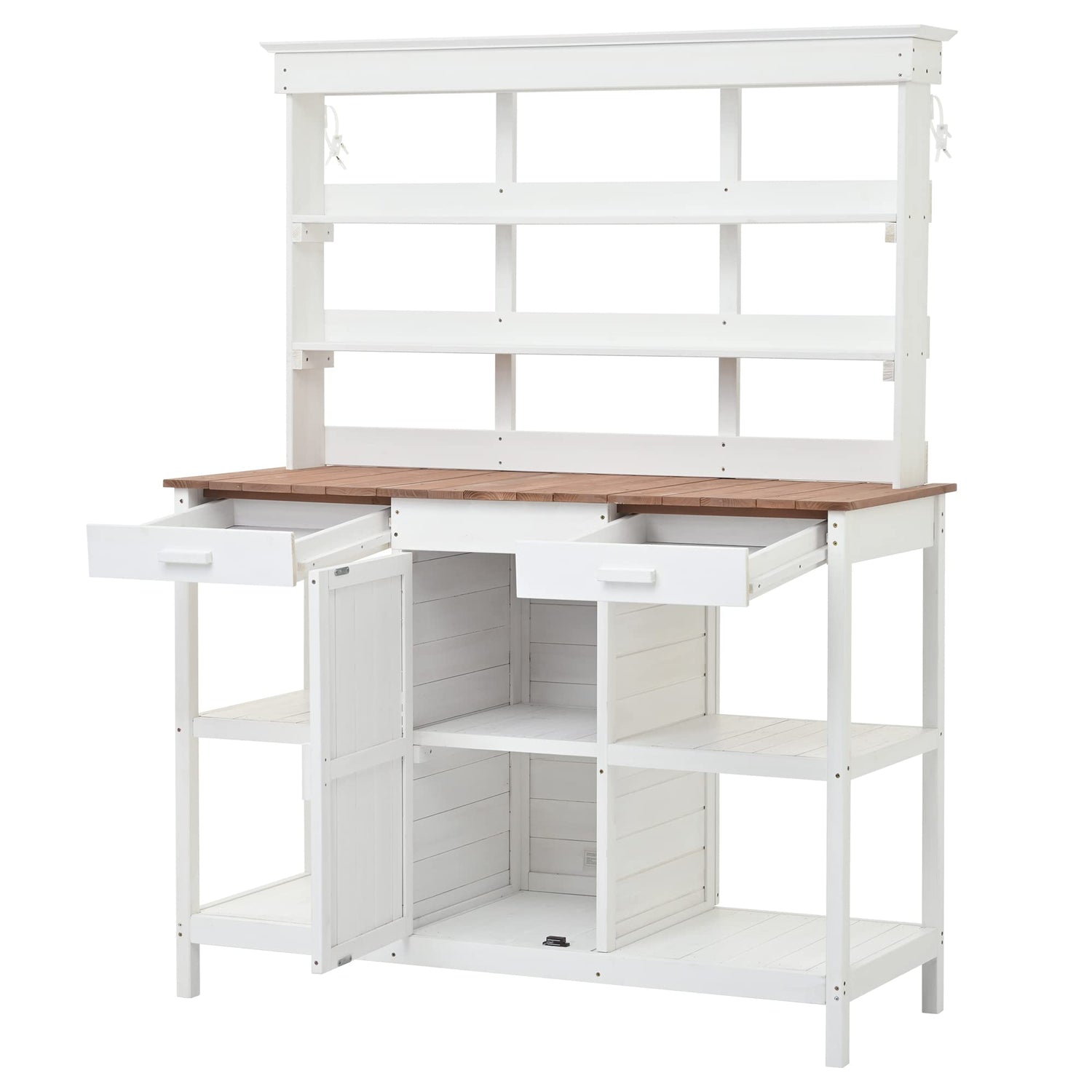 Merax 66" Large Outdoor Farmhouse Wooden Potting Bench Table, Garden Workstation with 2 Drawers, Cabinet, and Open Shelves for Backyard, Mudroom, White
