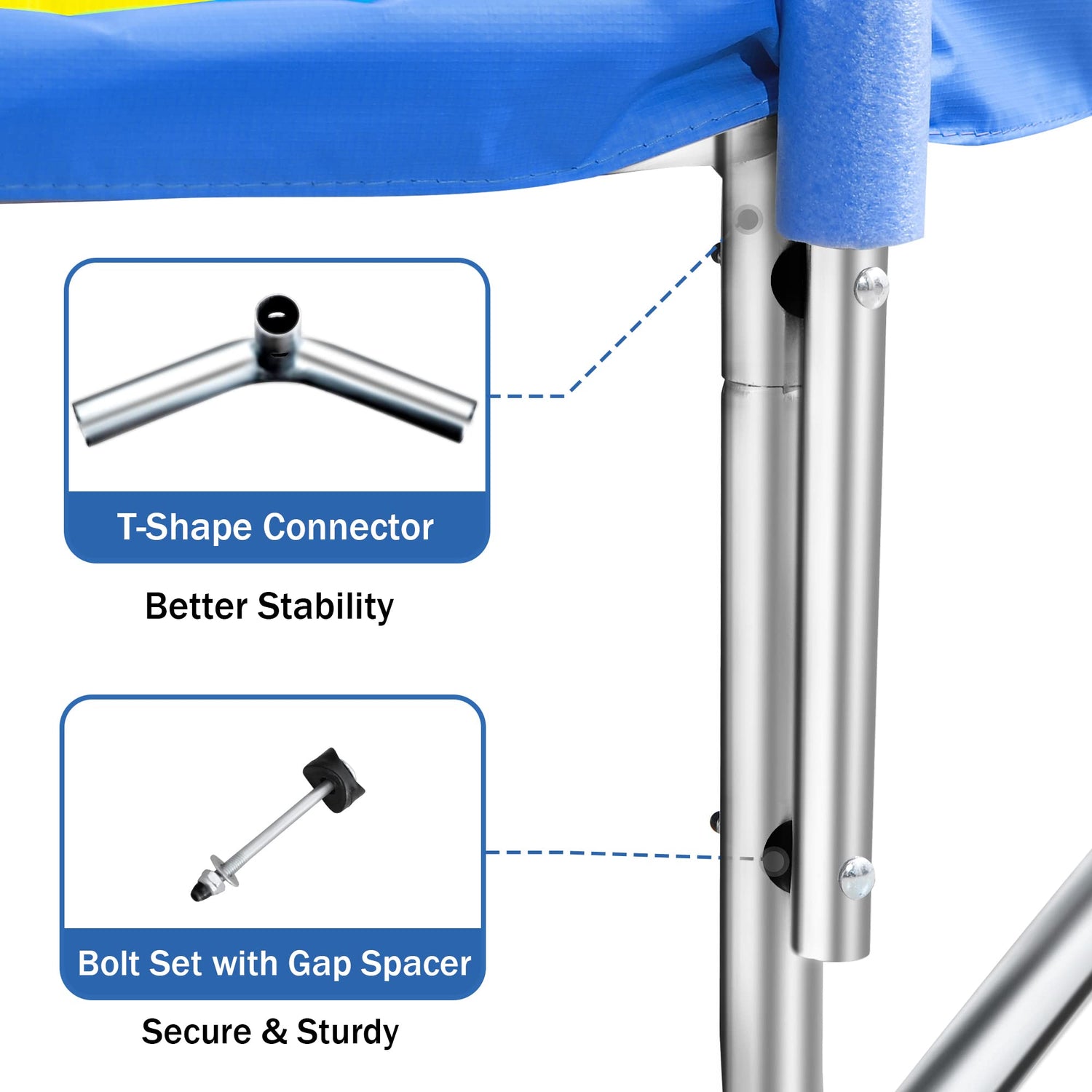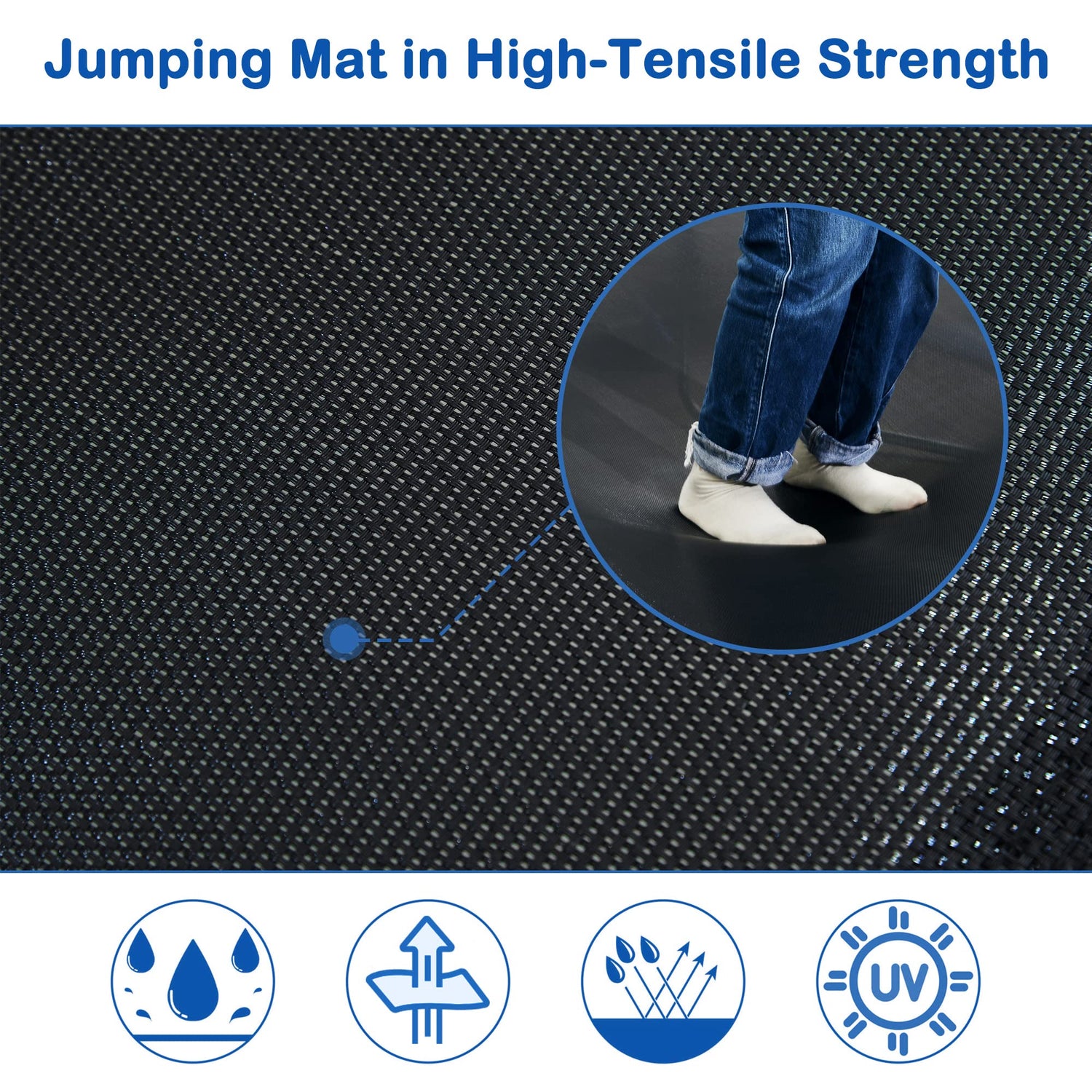 - [Active Anytime] It is important for kids to have a place to play at any time. This trampoline is designed to withstand the test of time and weather. Its entire circle of the safety net is supported by 100% high-strength polyester fiber. The addition of active UV protectors can make it better resist damage from the sun. The jumping mat tightly woven with high-elastic materials and 36 premium springs can let children jump freely and completely release their nature. It can bear up to 220 pound.