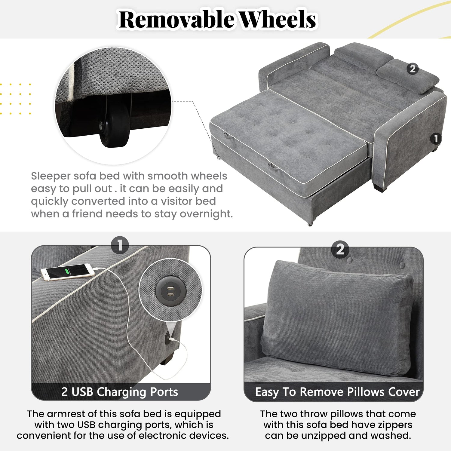 Merax Convertible Pull Out Sofa Bed, 65.7" Upholstered Sleeper Sofa with Dual USB Charging Port, Adjustable Backrest and 2 Pillows, Button Tufted Loveseat Couch for Living Room Bedroom, Charcoal Grey