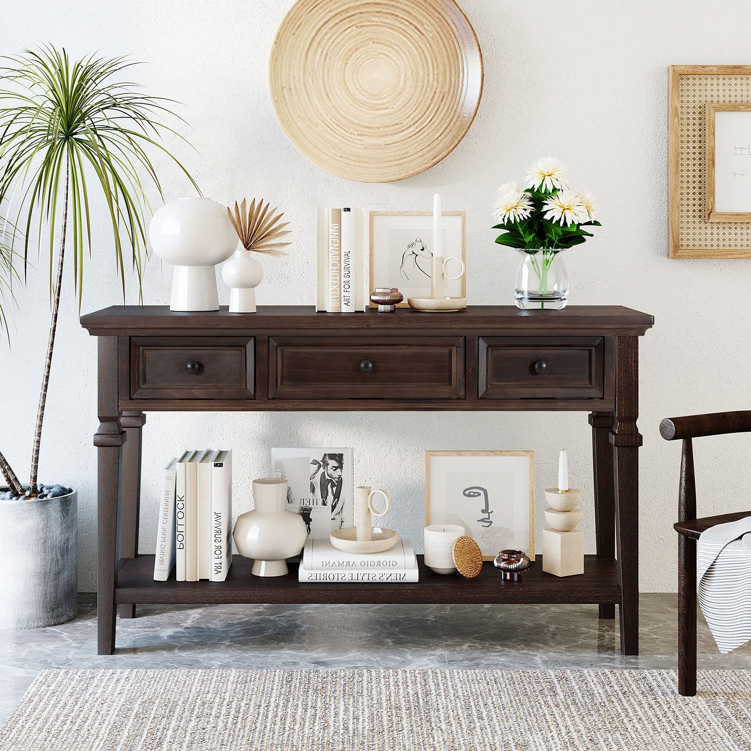 Merax Espresso Wood Farmhouse Entry Way Hallway Console Table with Drawers and Bottom Shelf Narrow Long Sideboard for Living Room Bedroom, Type 9