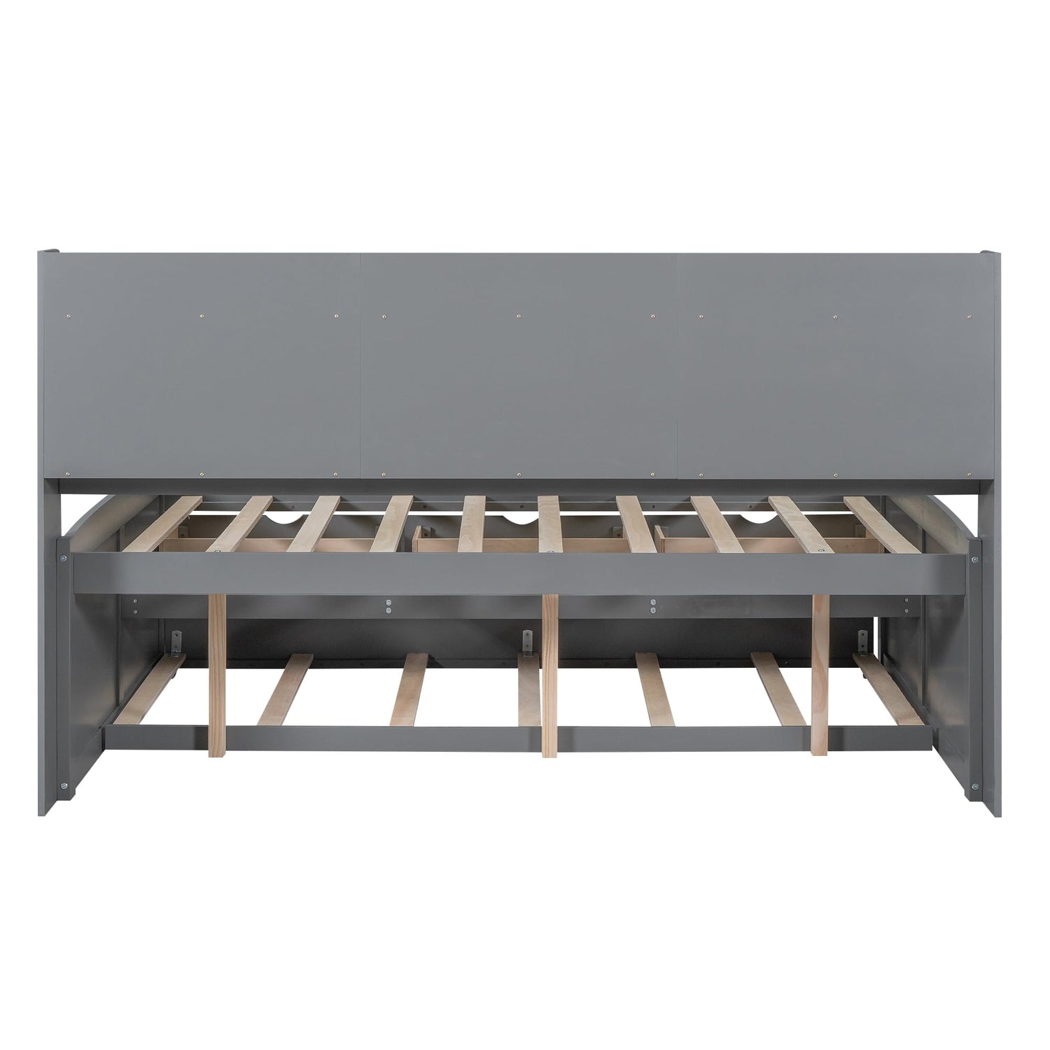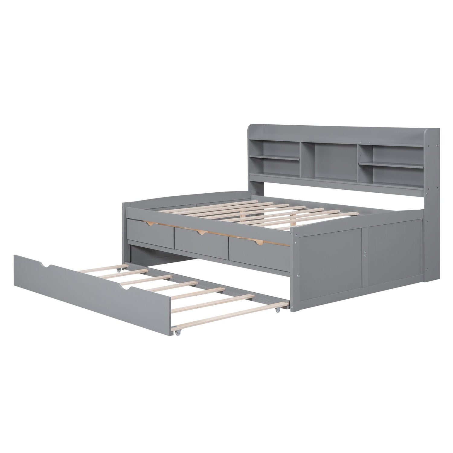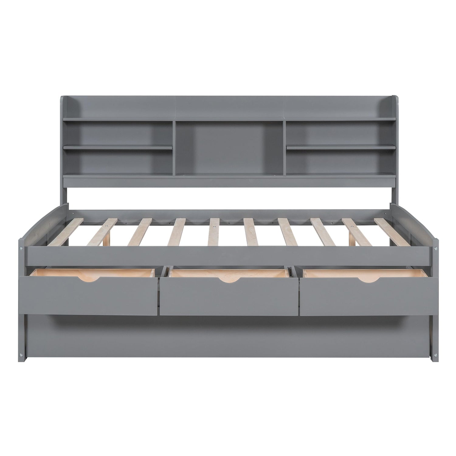 Merax Full Corner Bed Frame with Bookcase Storage, Daybed with Trundle & 3 Drawers Solid Wooden Platform Bedframe Captain Bed for Living Room,Bedroom & Guest Room, Grey