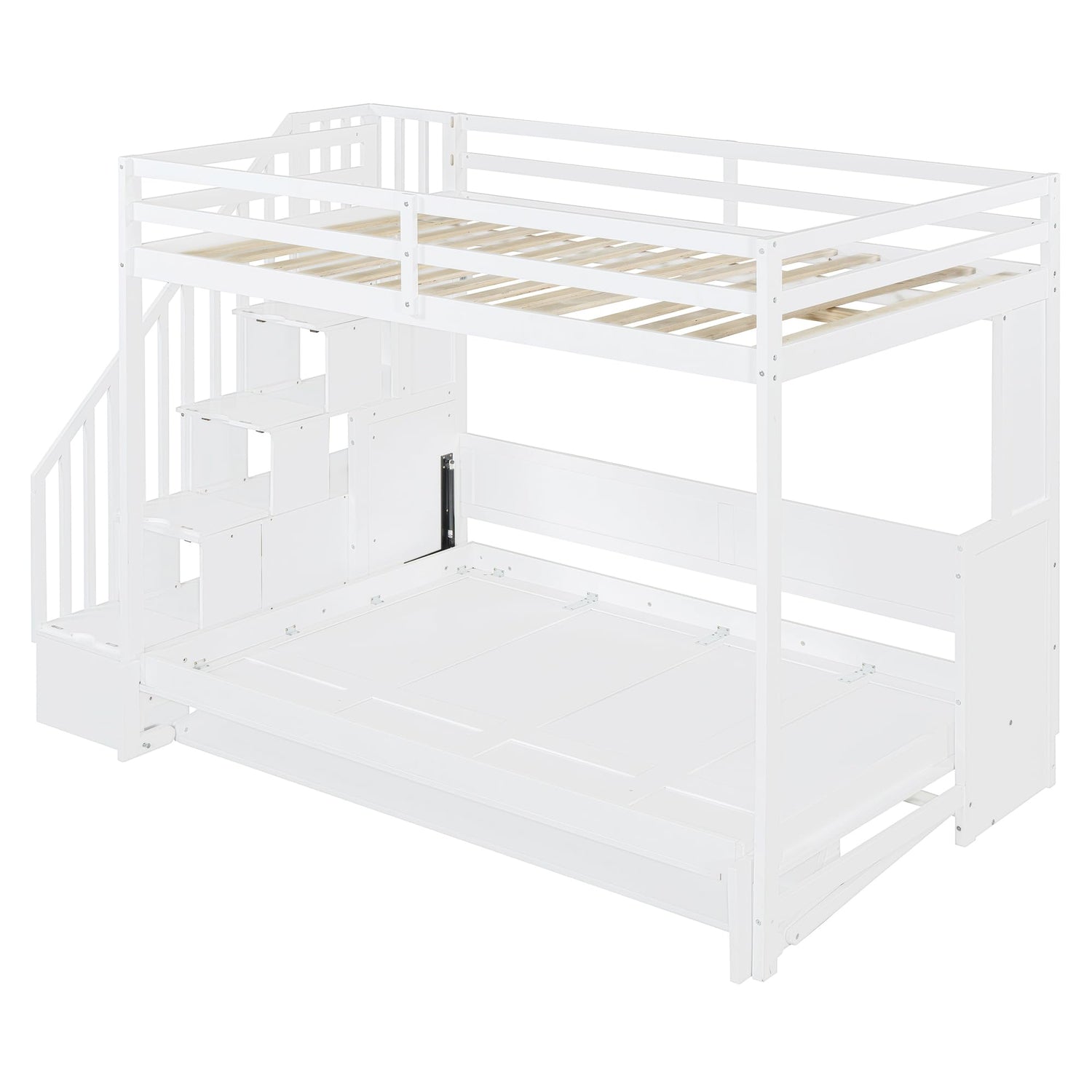 Merax Full Over Full Farmhouse Loft Bed with Murphy Cabinet Bed w/Hydraulic Lift, Solid Wood Wall Bunk Bed with Storage Staircase, Shleves & Desk/No Box Spring Needed/Easy Assemble/White
