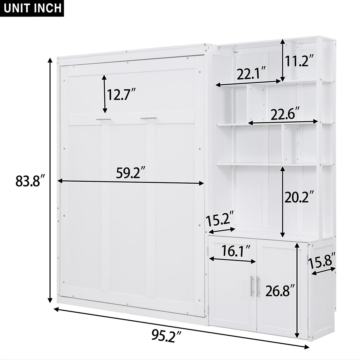 Merax Full Size Murphy Bed, White Wood Wall Bed Cabinet with Multiple Storage Shelves and a Cabinet