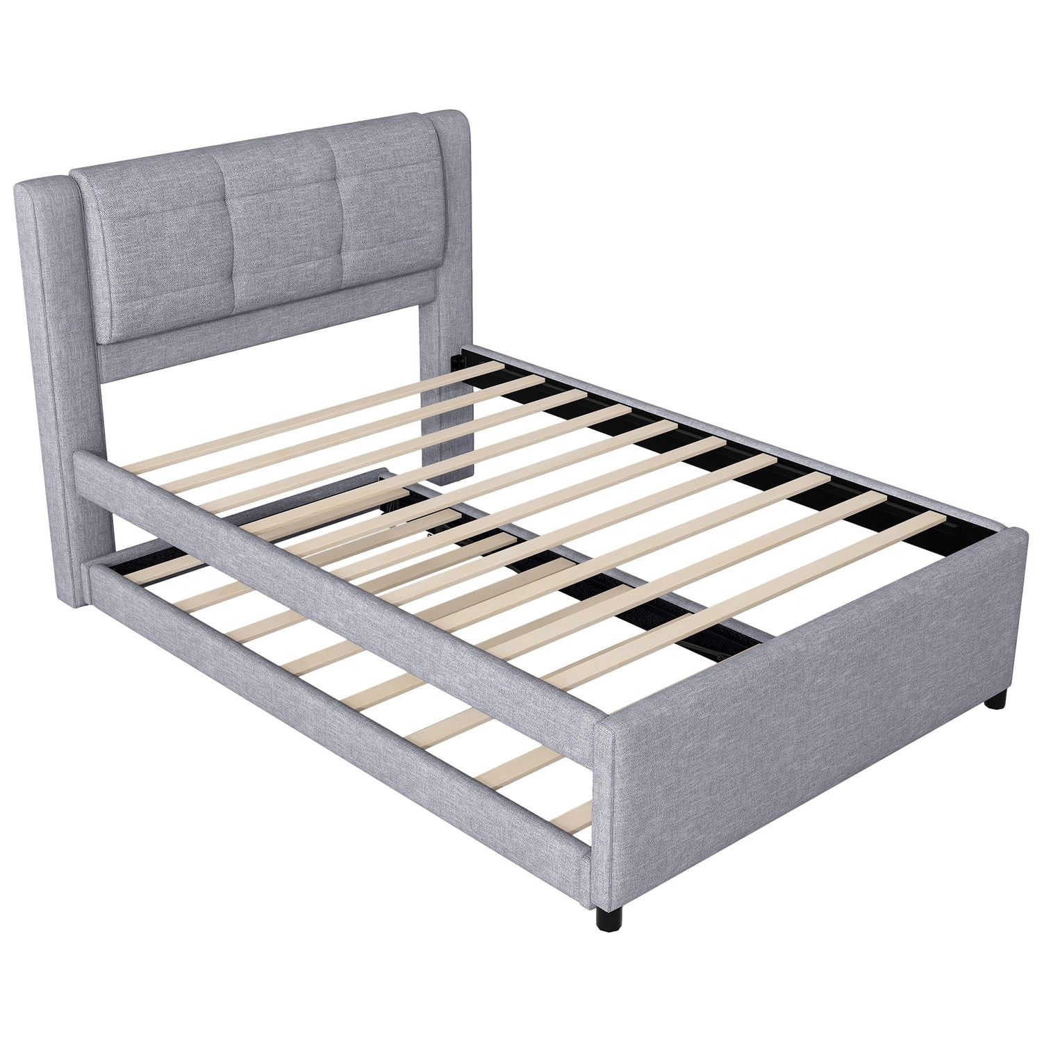 Merax Full Size Upholstery Platform Bed with Trundle,Trundle can be Flat or Erected, Modern Bed Frame with Linen Headboard for Kids, Adults, No Box Spring Needed, Gray