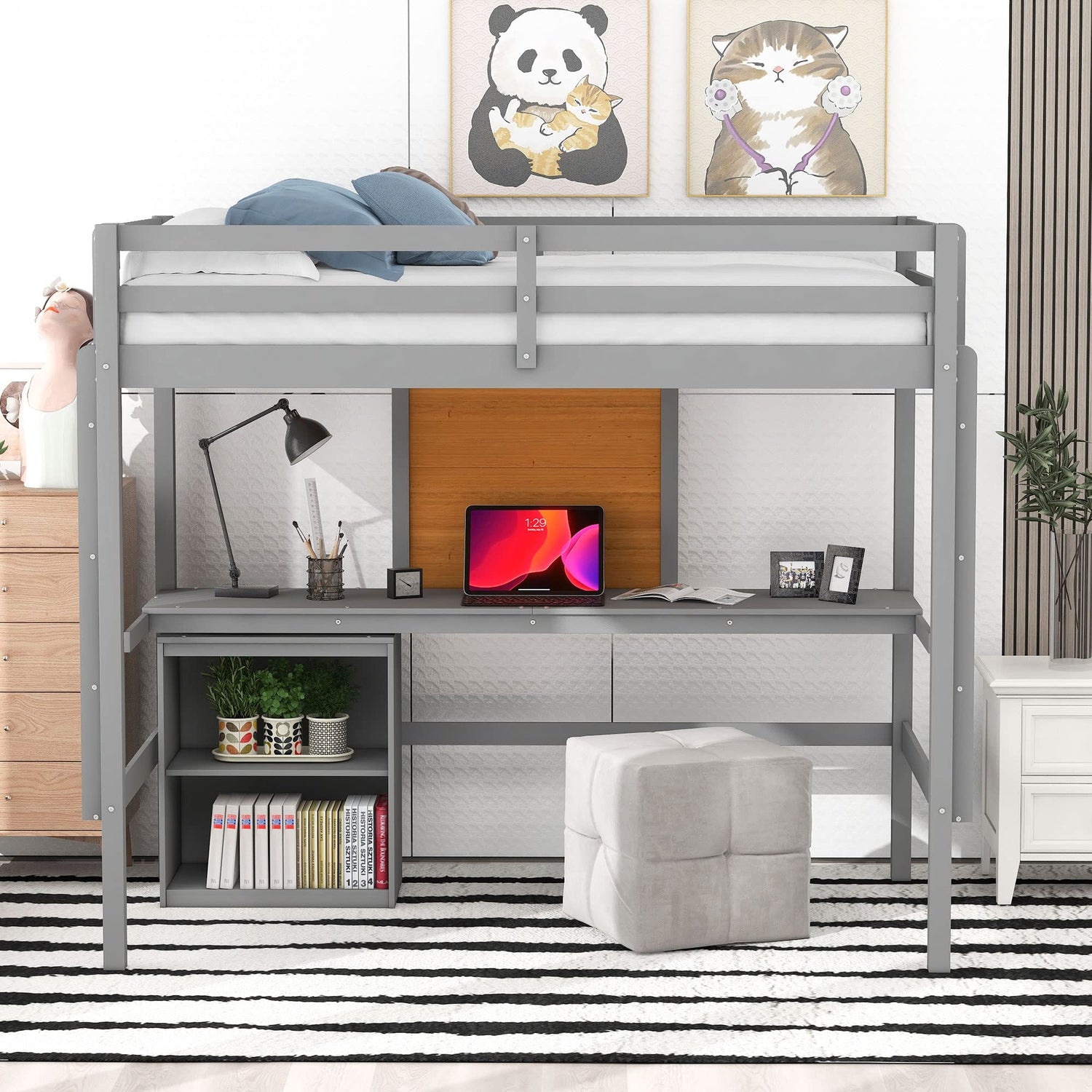 Merax Grey Twin Loft Bed with Desk and Storage – Sturdy Wooden Frame with Writing Board and Dual Ladder Design