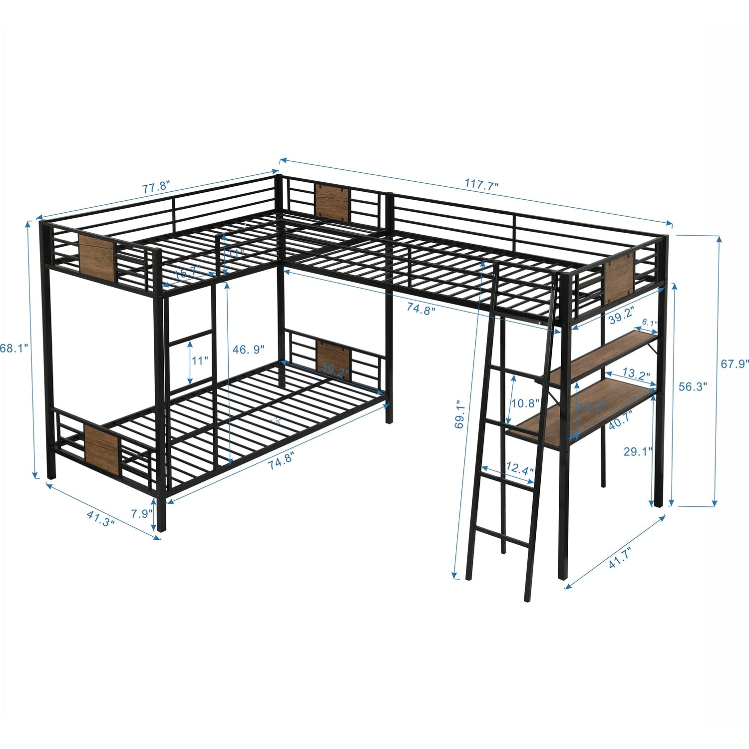Merax Metal L-Shaped Twin Over Twin Bunk Bed with a Twin-Size Loft Bed Attached, Triple Bunk Bed with Desk and Shelf for Teens, Adults, Black and Brown Wood