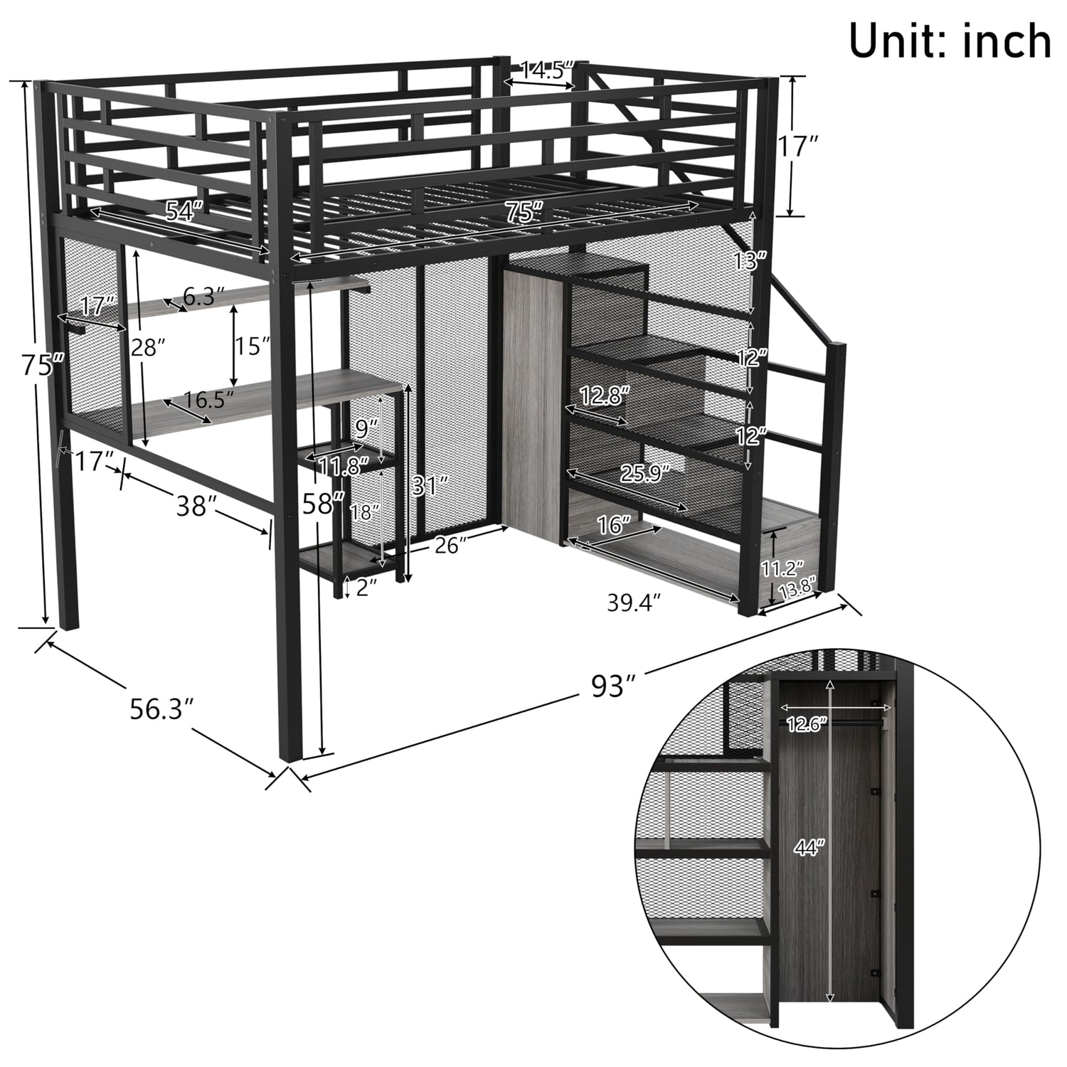 Merax Modern Full Heavy Metal Loft Bed with Wardrobe & Desk, Multifunction Loft Bed Frame with Staircase, Storage Shelves for Bedroom, Dorm, Appartment Space-Saving Black