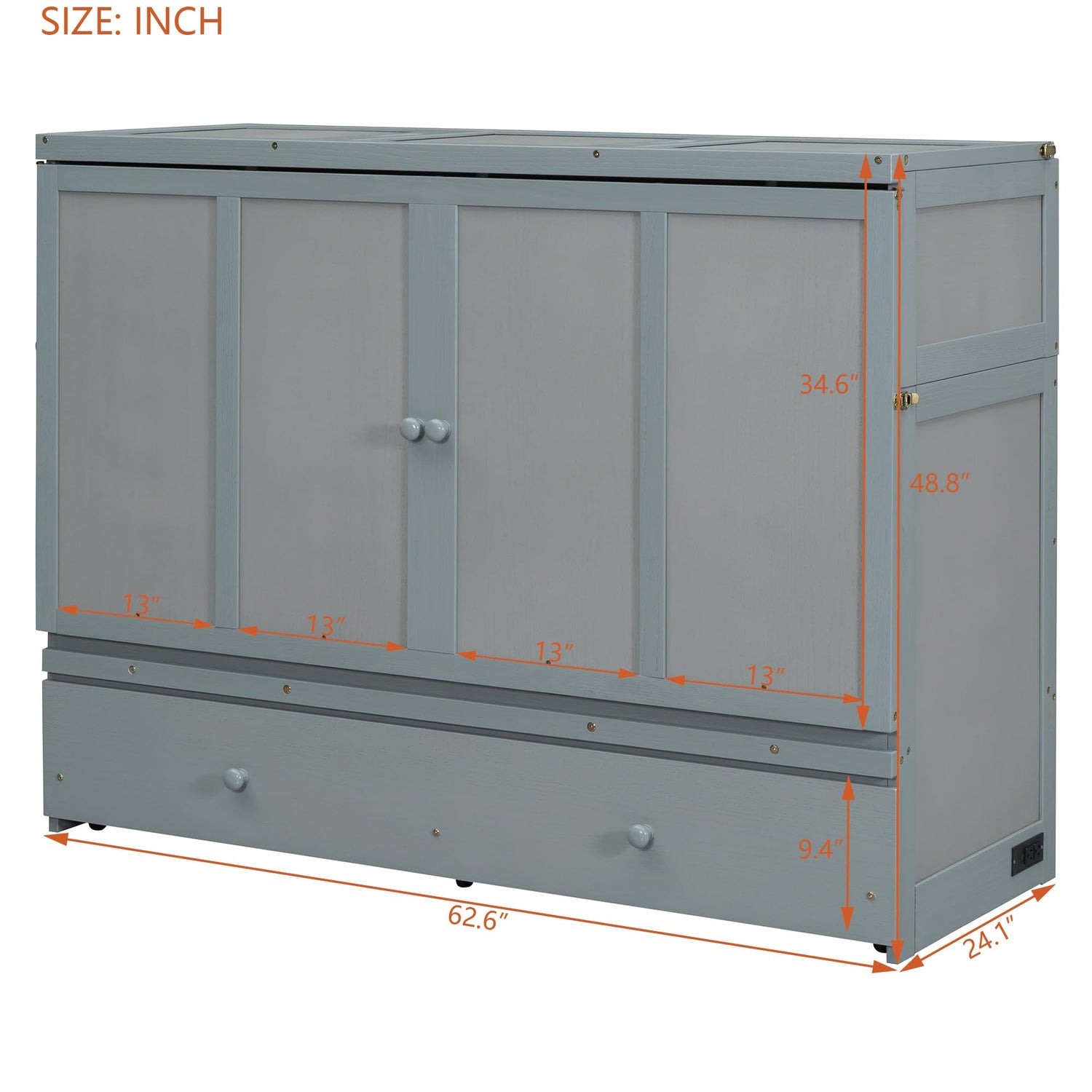 Merax Queen Murphy Bed Cabinet with Storage Drawers, Chest Cube Bed for Guest Room, Built-in Sockets & USB Ports, for Home Office or Small Bedroom, Grey