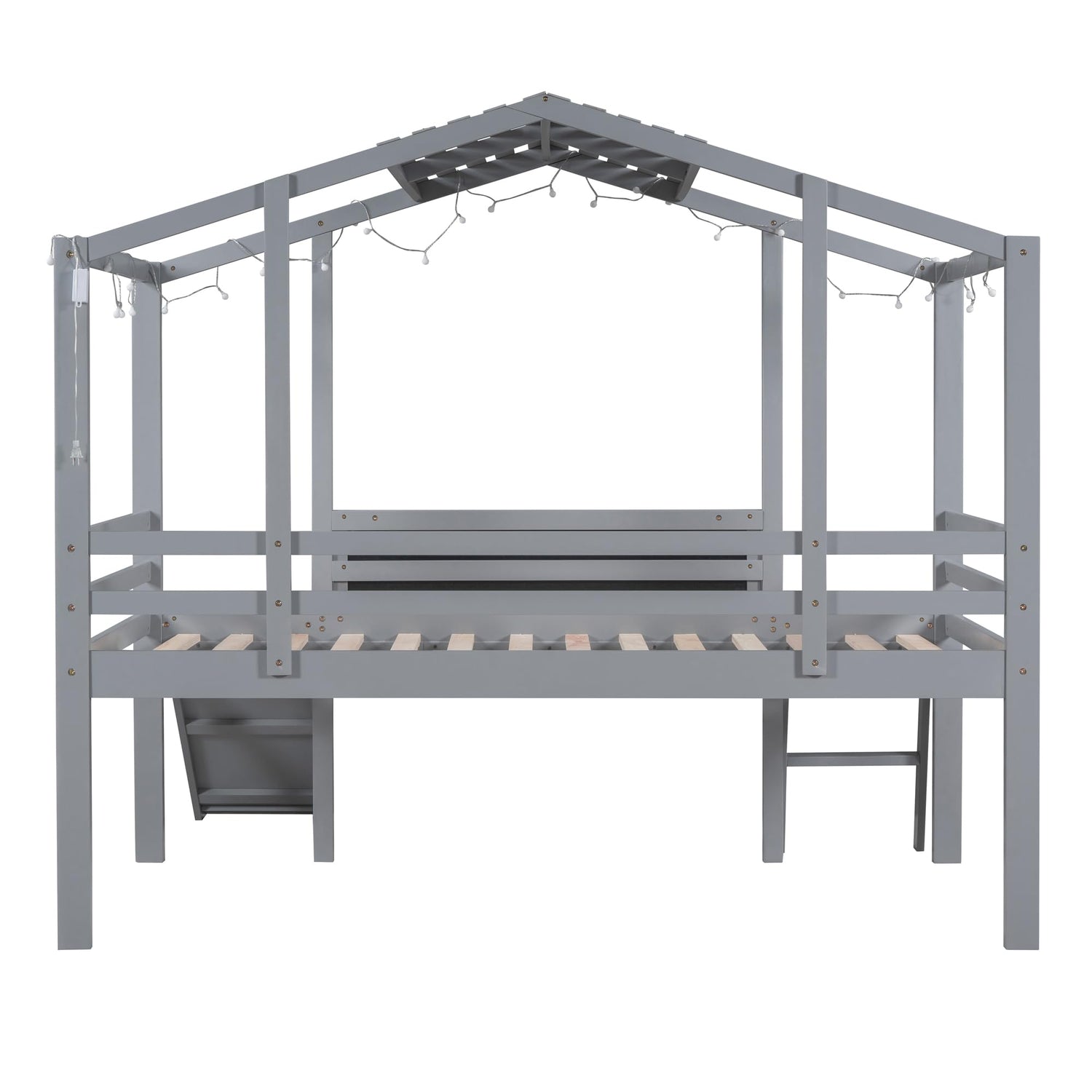 Merax Twin Loft Bed with Slide for Boys & Girls, Wood House Style with Blackboard & Light Strip, Grey