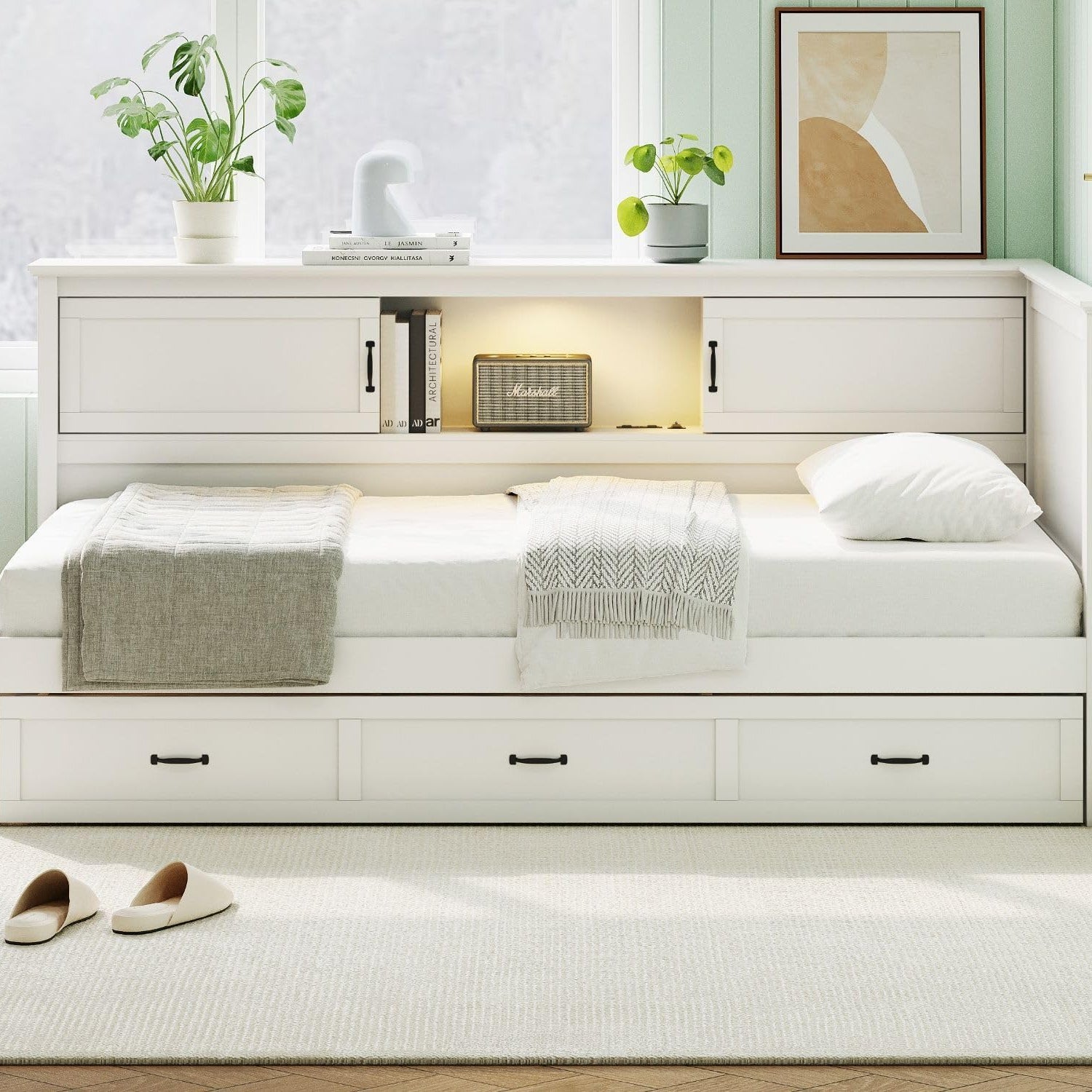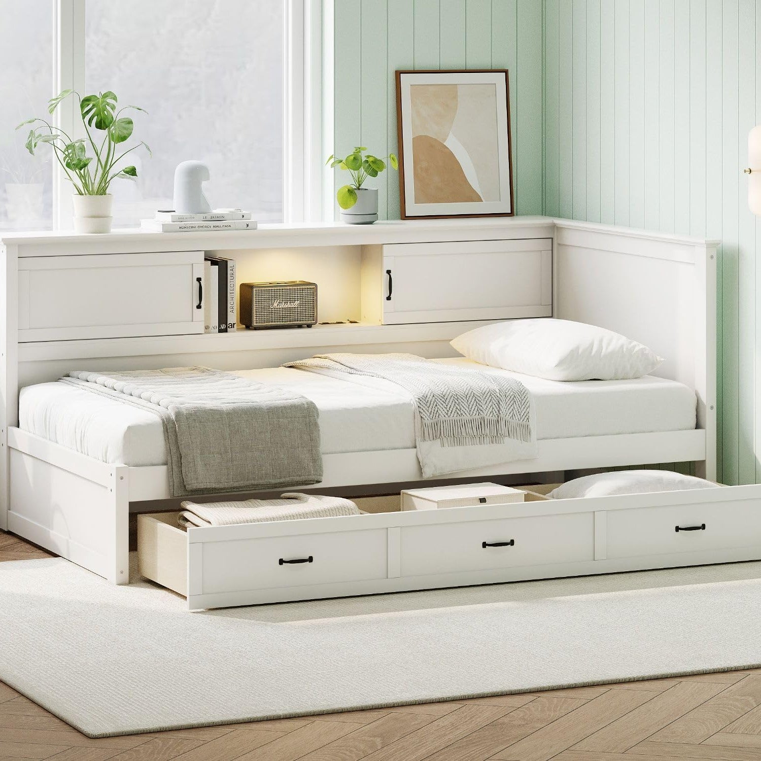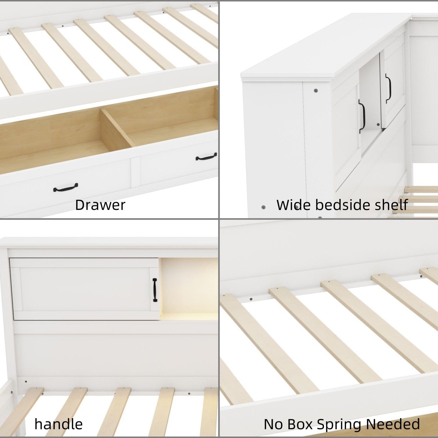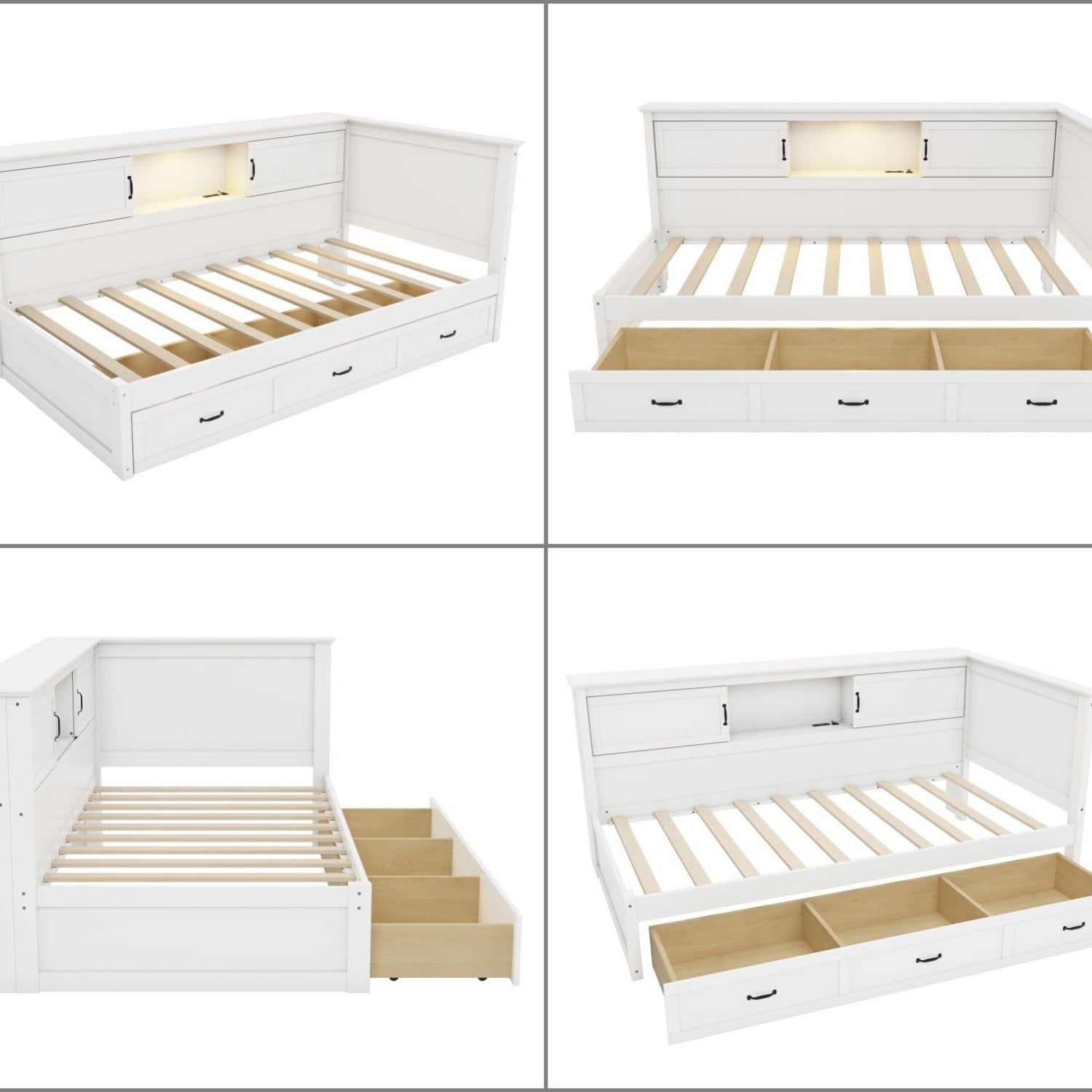 - Storage Space: There are built-in storage cabinets on one side of the twin corner daybed, which provide you plenty of storage space. Whether it's books or dolls, they can all find their place.The wood slats support the mattresses not to slide and increase the service life.