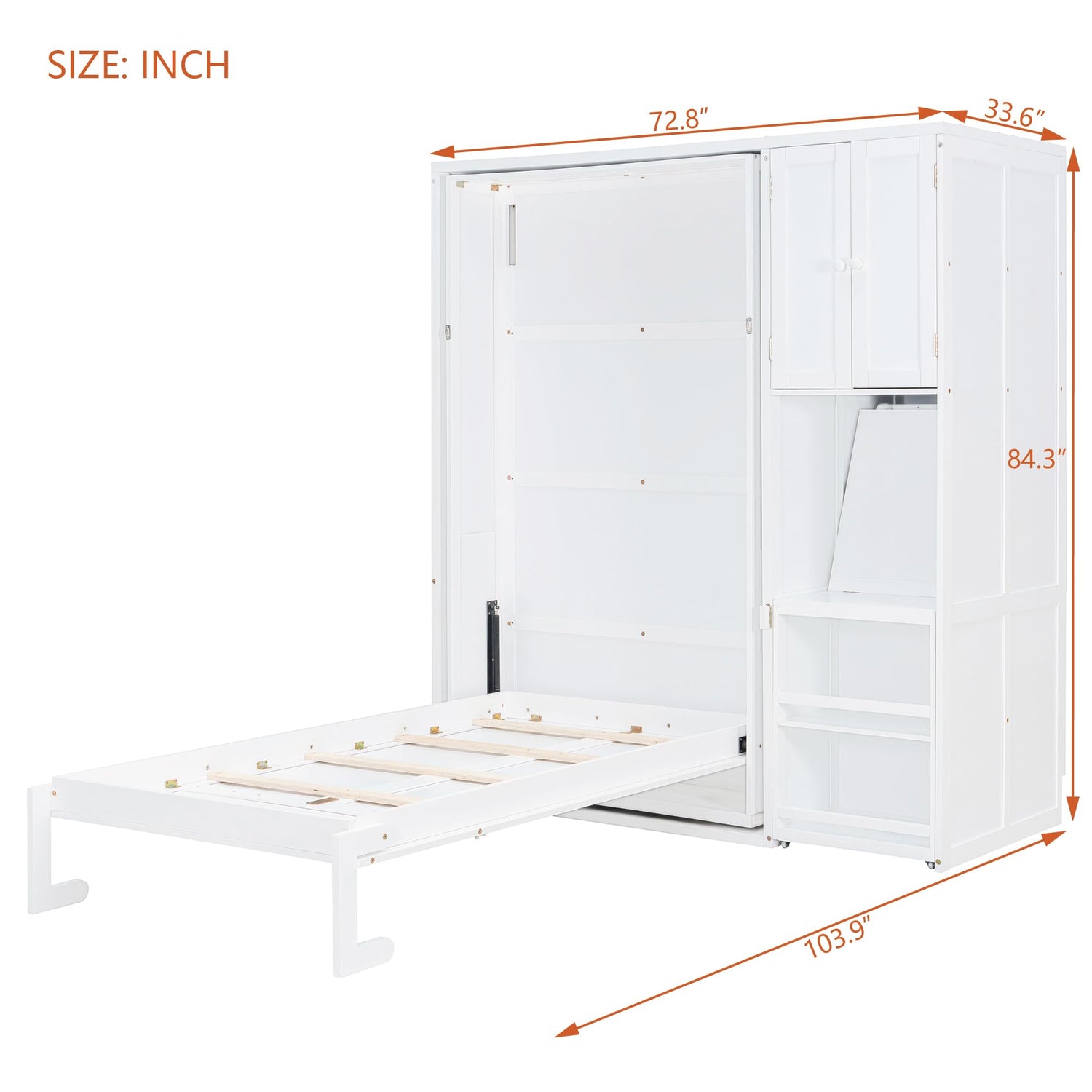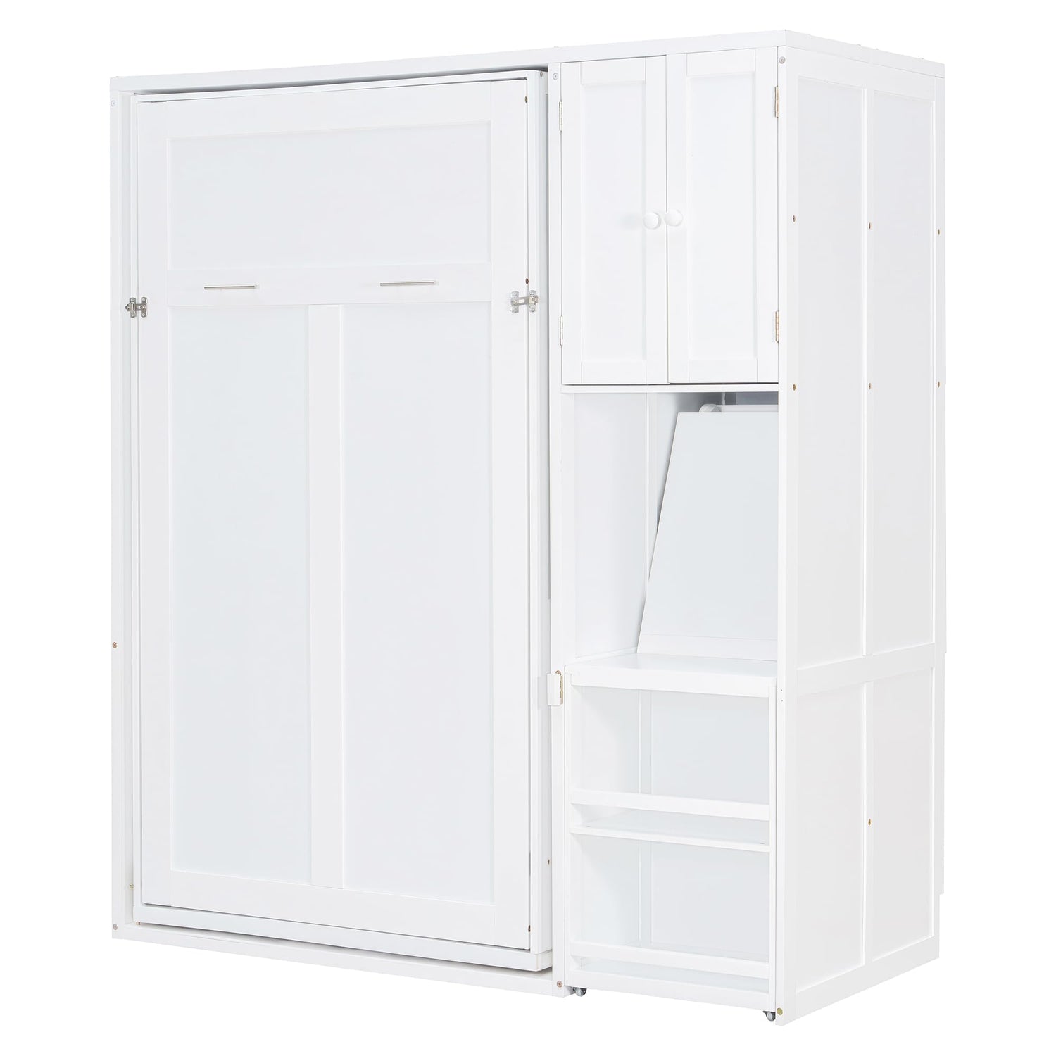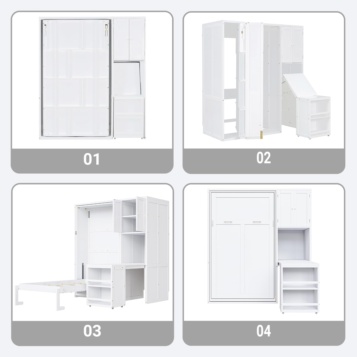 Merax Twin Size Rotating Wall Murphy Beds, Wood Folding Murphy Wall Bed with Bookshelf, Top Cabinet, Extendable Desk & Side Storage, White
