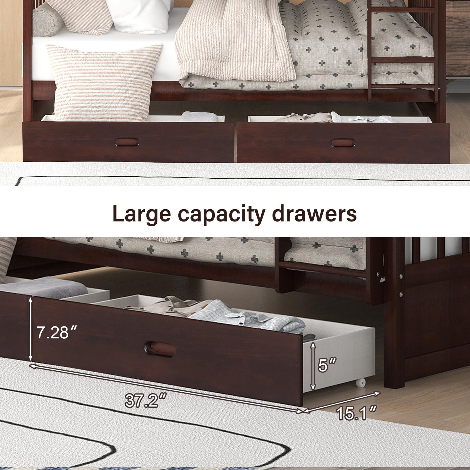 Merax Wood Bunk Bed with Drawers, Full Over Full Convertible Wood Bunk Bed with Ladders and Two Storage Drawers,Solid Wood Detachable Bunk Bed Frame with Ladders, Espresso