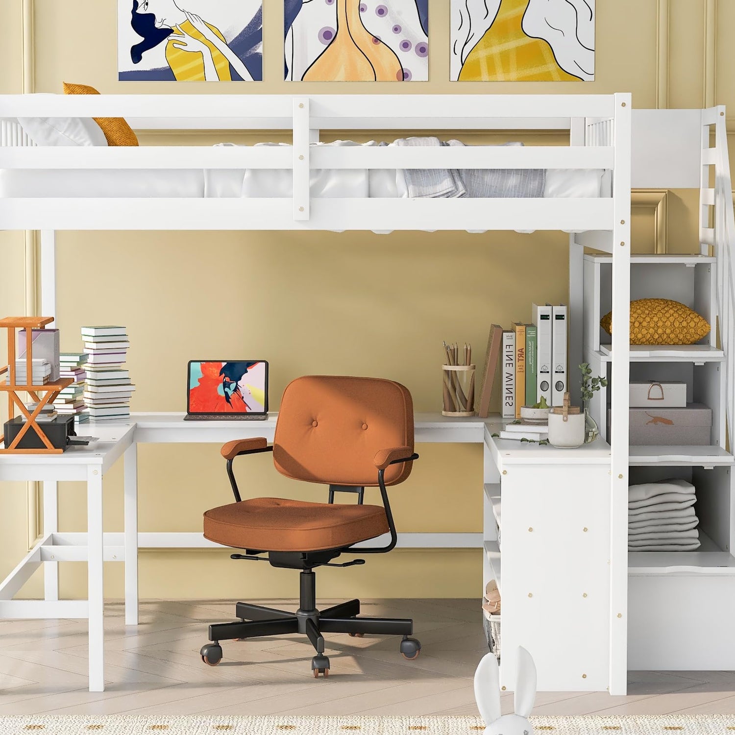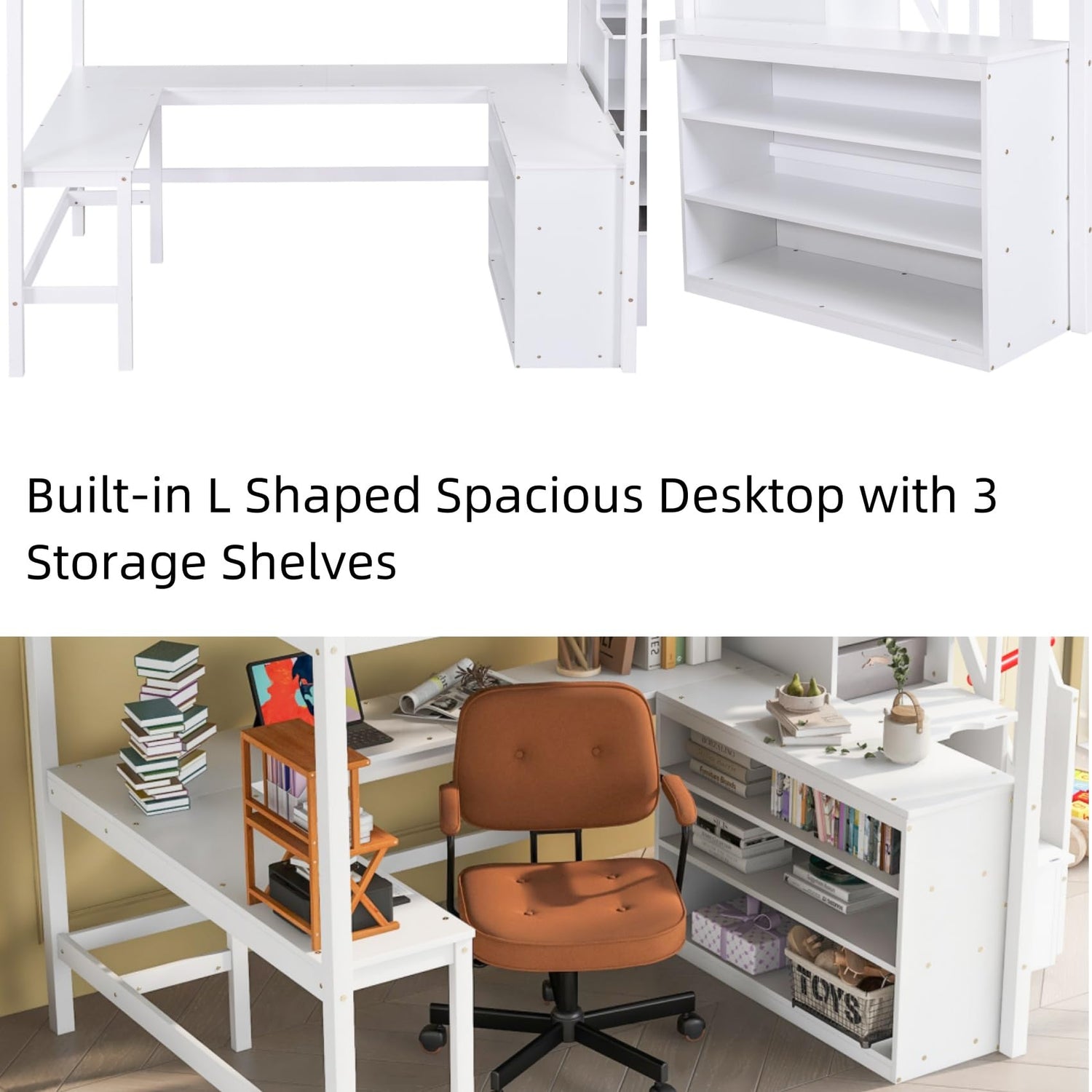 Designed with a spacious desktop and robust storage capabilities, this loft bed is equipped with Three-Tier Storage Shelves and integrated stair storage. It provides ample space for organizing books, files, printers, clothes, and decor, ensuring that everything you need is within easy reach while keeping your area tidy.