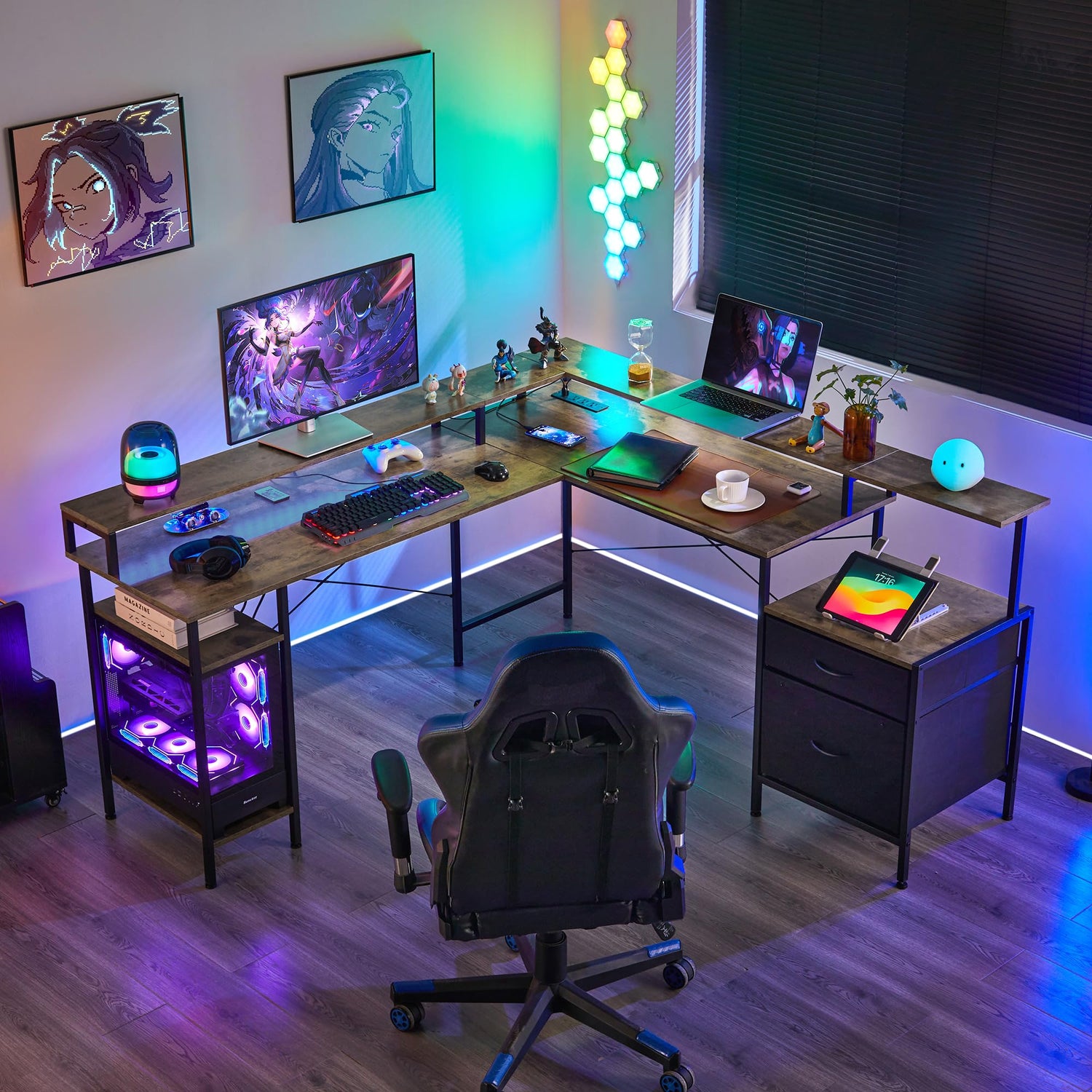 - 【L-shaped corner desk with drawers】The unique L-shaped design not only makes full use of corner spaces and improves space utilization but also can be combined into a straight-line desk according to needs. It is flexibly adaptable to different room layouts and usage scenarios. Whether it's a small, compact space or a large, spacious room, it can find a suitable placement method, providing users with diverse solutions for office or gaming spaces.